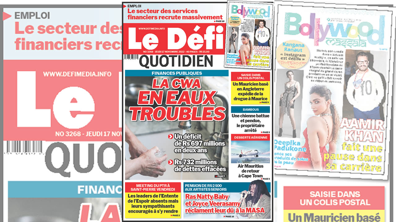 đ° Voici la Une du DĂ©fi Quotidien. Le journal est en vente Ă Rs 15 l'exemplaire aux endroits habituels (supermarchĂ©s, boutiques, tabagies, superettes). Bonne lecture !