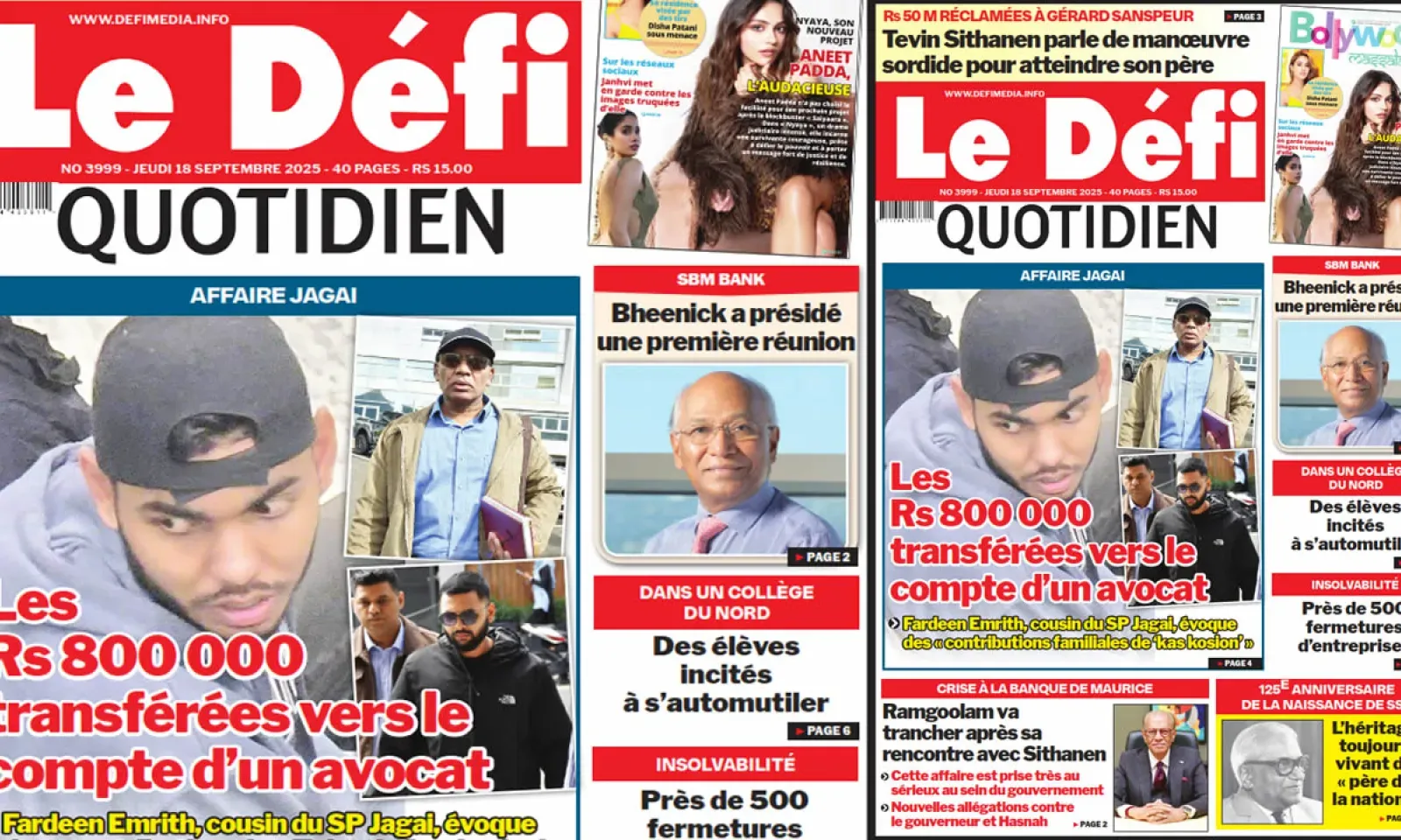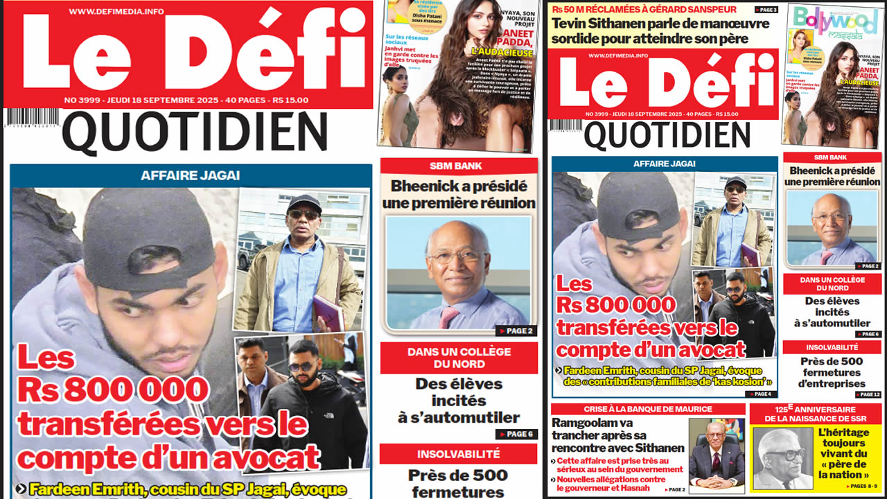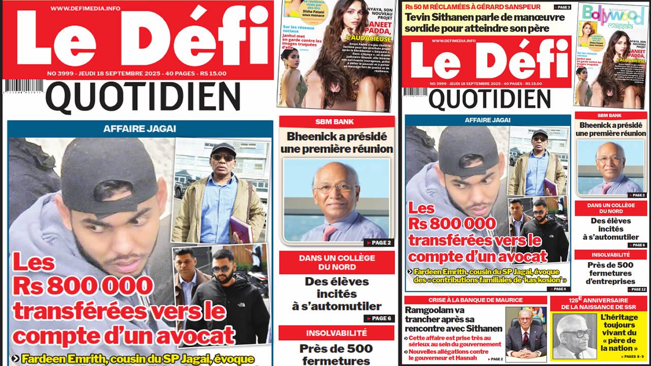 ? Voici la Une du Défi Quotidien. Le journal est en vente à Rs 15 l'exemplaire aux endroits habituels (supermarchés, boutiques, tabagies, superettes). Bonne lecture !