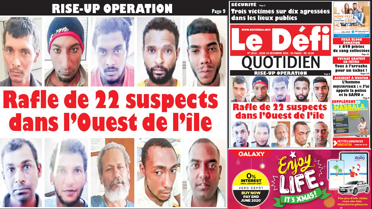 ‘Rise-up Operation’ policière mercredi : Rafle de 22 suspects dans l’Ouest de l’île
