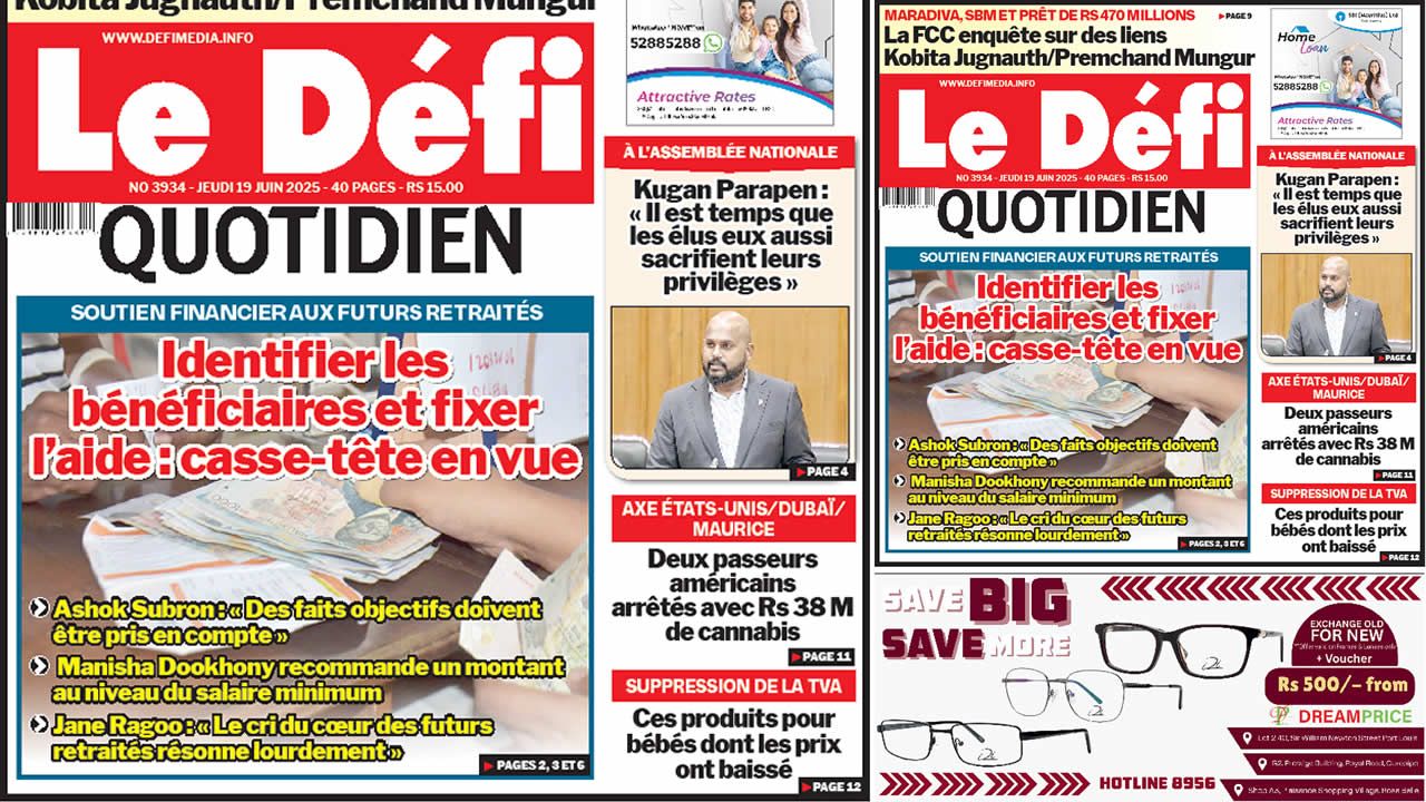? Voici la Une du Défi Quotidien. Le journal est en vente à Rs 15 l'exemplaire aux endroits habituels (supermarchés, boutiques, tabagies, superettes). Bonne lecture !