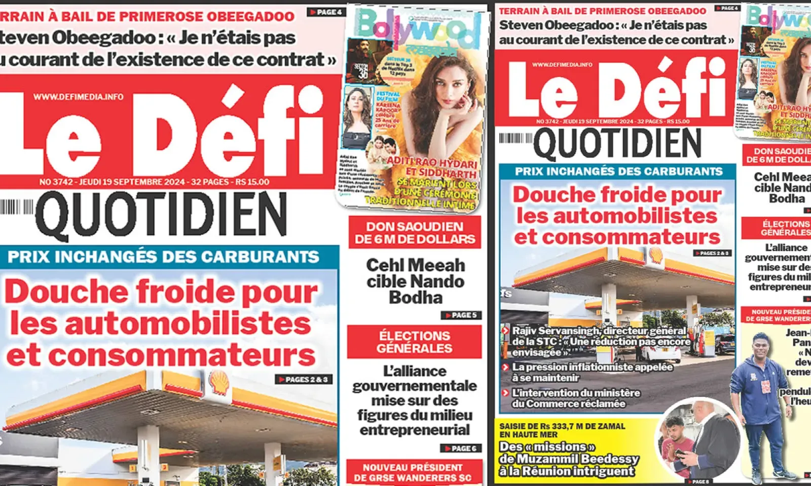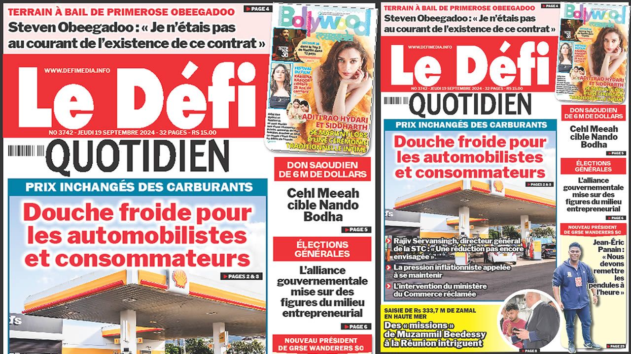 ? Voici la Une du Défi Quotidien. Le journal est en vente à Rs 15 l'exemplaire aux endroits habituels (supermarchés, boutiques, tabagies, superettes). Bonne lecture !