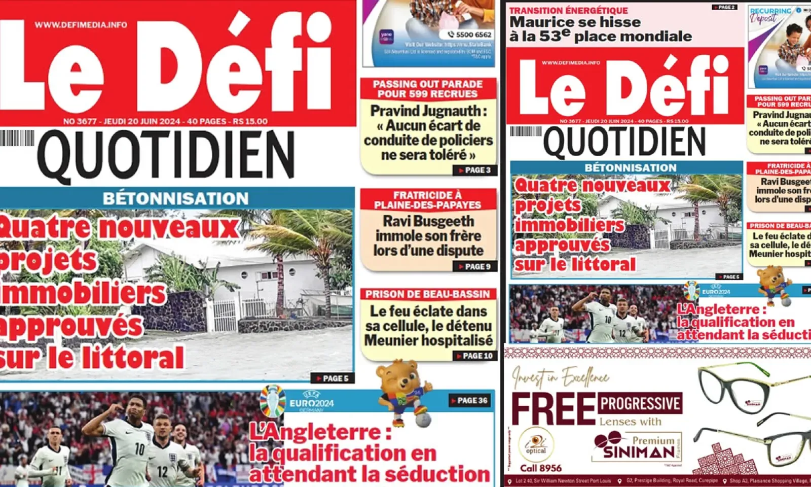 ? Voici la Une du Défi Quotidien. Le journal est en vente à Rs 15 l'exemplaire aux endroits habituels (supermarchés, boutiques, tabagies, superettes). Bonne lecture !