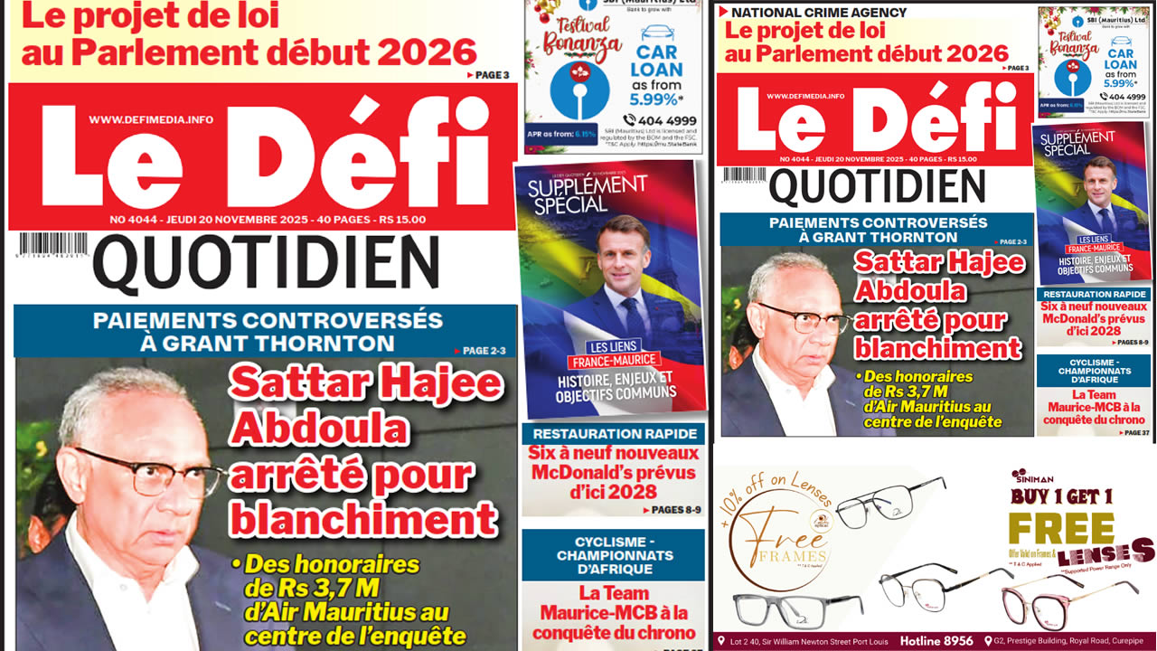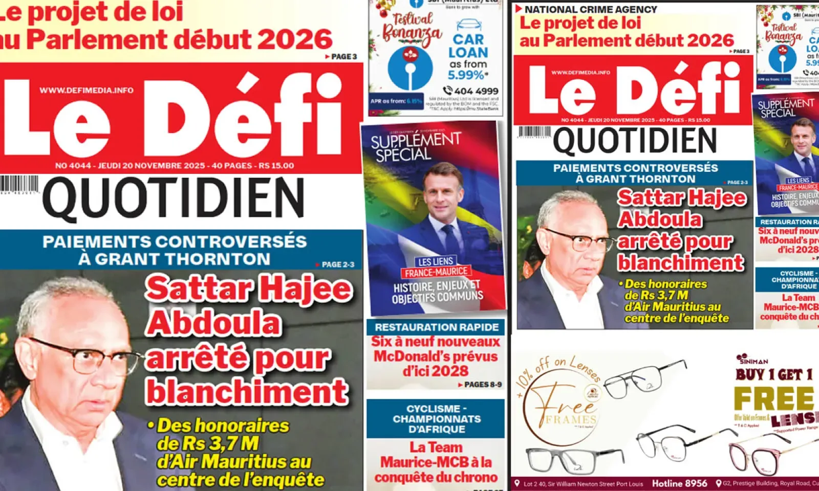 Voici la Une du Défi Quotidien. Le journal est en vente à Rs 15 l'exemplaire aux endroits habituels (supermarchés, boutiques, tabagies, superettes). Bonne lecture !