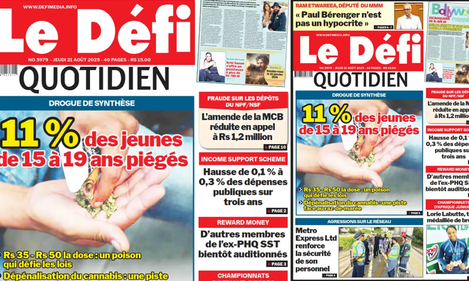 ? Voici la Une du Défi Quotidien. Le journal est en vente à Rs 15 l'exemplaire aux endroits habituels (supermarchés, boutiques, tabagies, superettes). Bonne lecture !