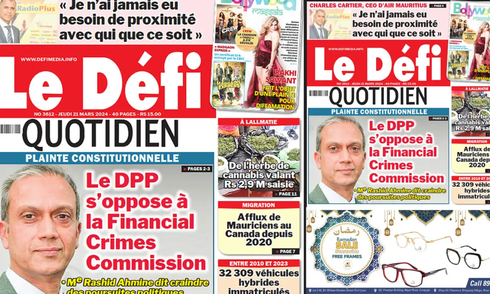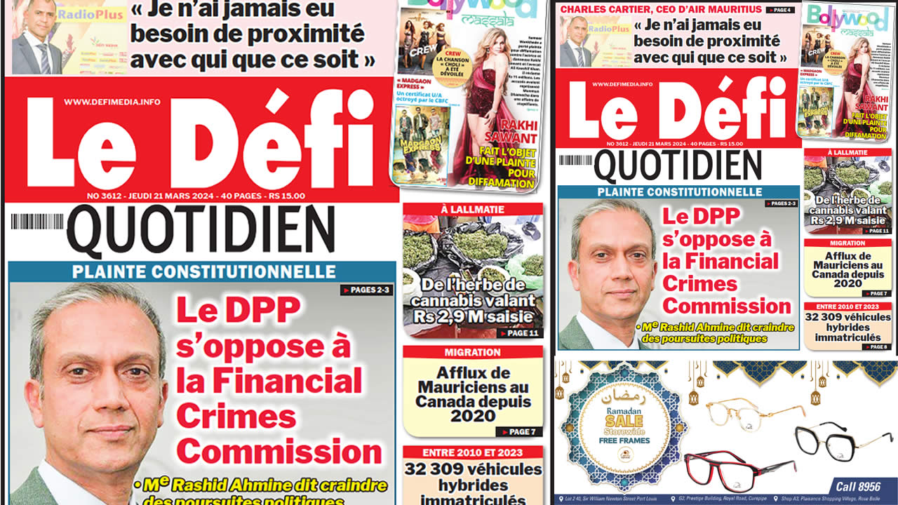 ? Voici la Une du Défi Quotidien. Le journal est en vente à Rs 15 l'exemplaire aux endroits habituels (supermarchés, boutiques, tabagies, superettes). Bonne lecture !