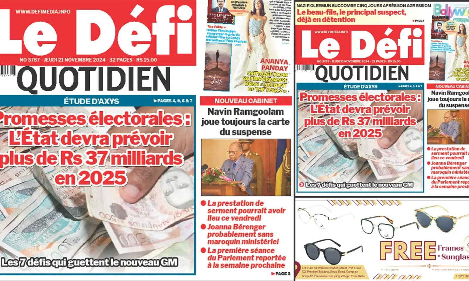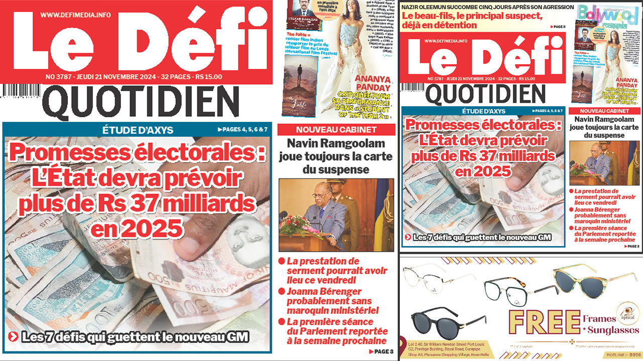 ? Voici la Une du Défi Quotidien. Le journal est en vente à Rs 15 l'exemplaire aux endroits habituels (supermarchés, boutiques, tabagies, superettes). Bonne lecture !