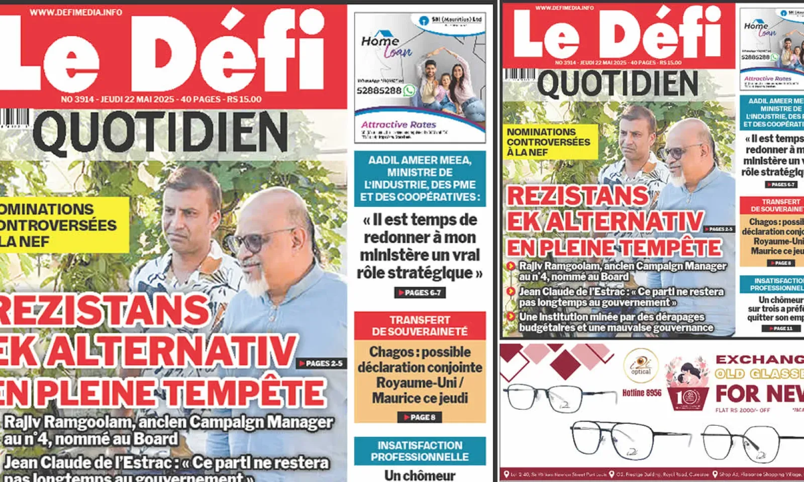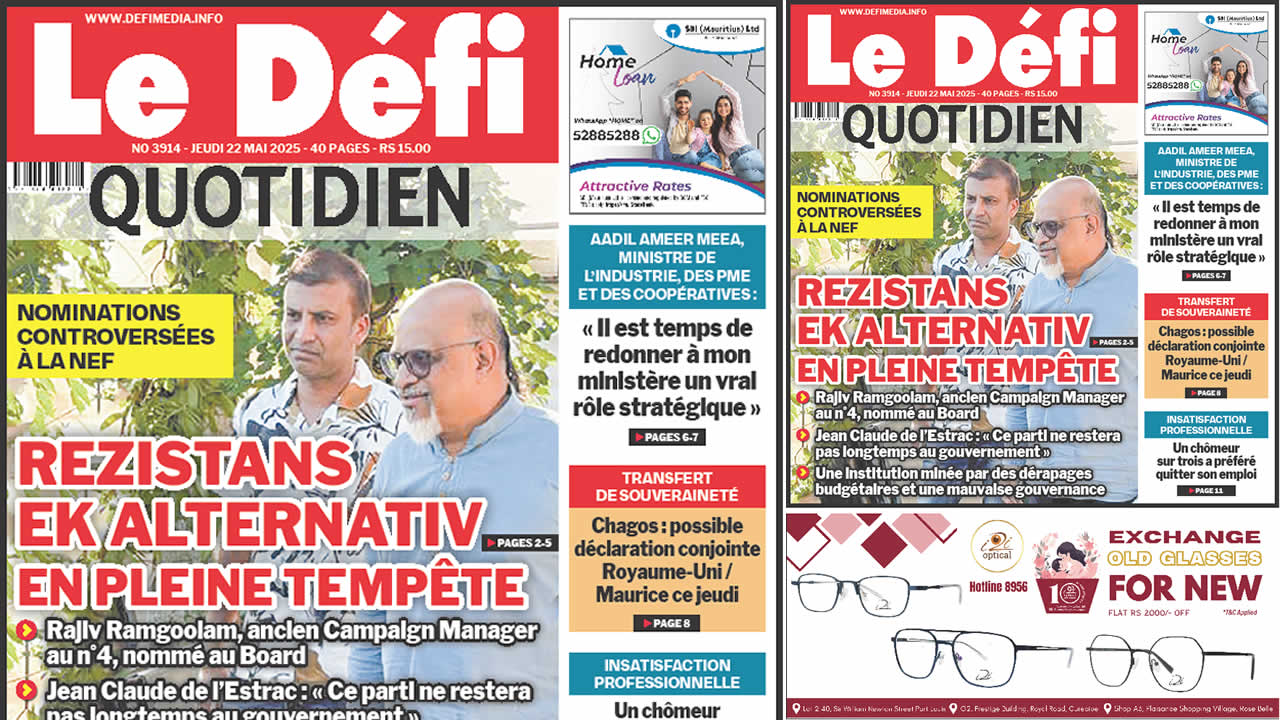 ? Voici la Une du Défi Quotidien. Le journal est en vente à Rs 15 l'exemplaire aux endroits habituels (supermarchés, boutiques, tabagies, superettes). Bonne lecture !