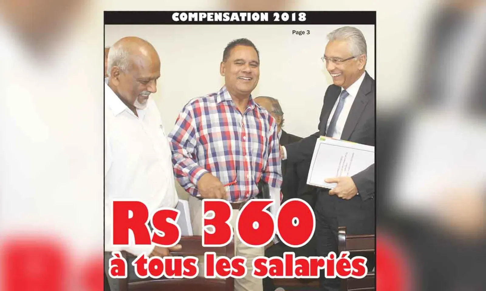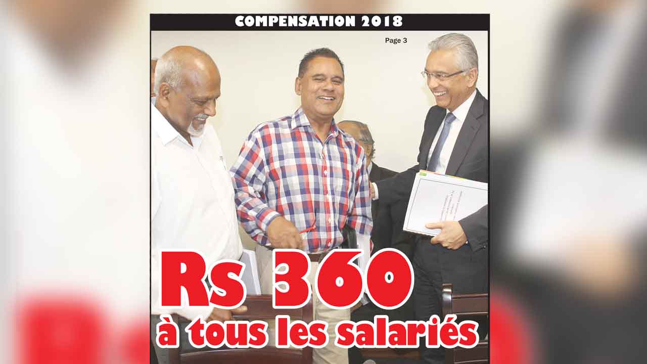 Le gouvernement a décidé d’octroyer une compensation salariale uniforme de Rs 360. Elle coûtera Rs 1,7 milliard au secteur privé et Rs 500 millions au secteur public. Ce qui fait un total de Rs 2,2 milliards. Cette compensation entrera en vigueur à partir de janvier 2018.