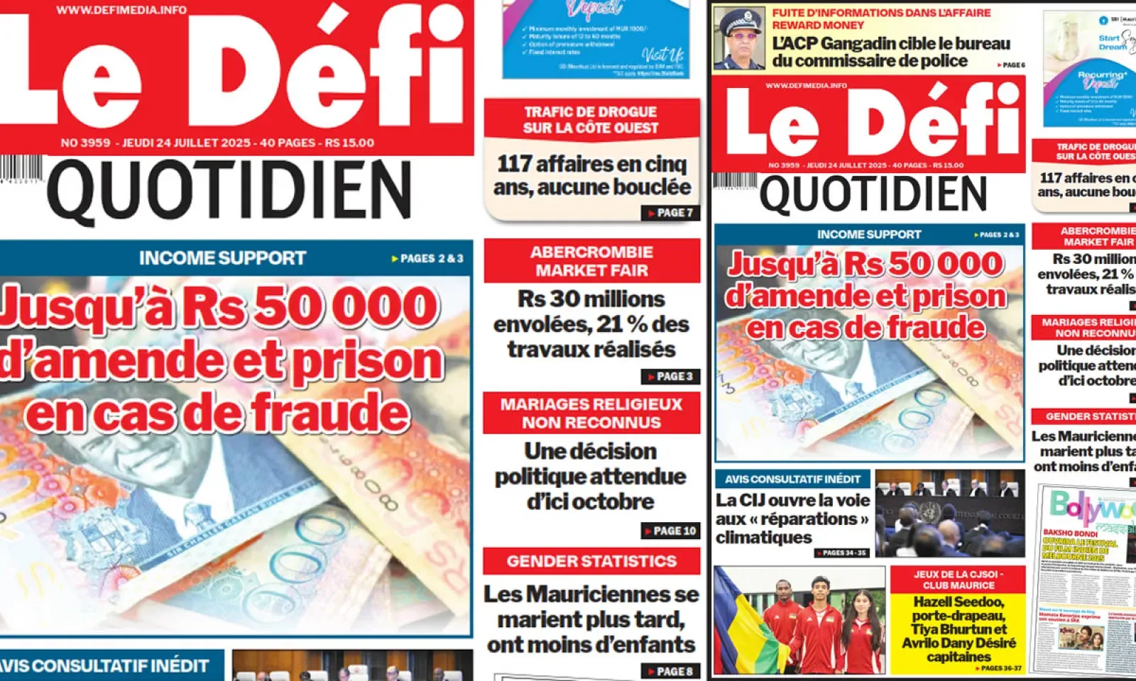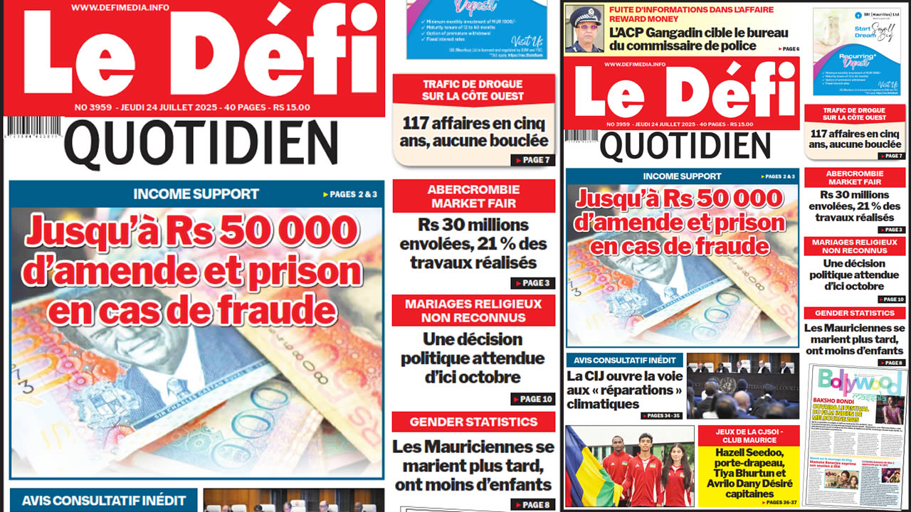 ? Voici la Une du Défi Quotidien. Le journal est en vente à Rs 15 l'exemplaire aux endroits habituels (supermarchés, boutiques, tabagies, superettes). Bonne lecture !