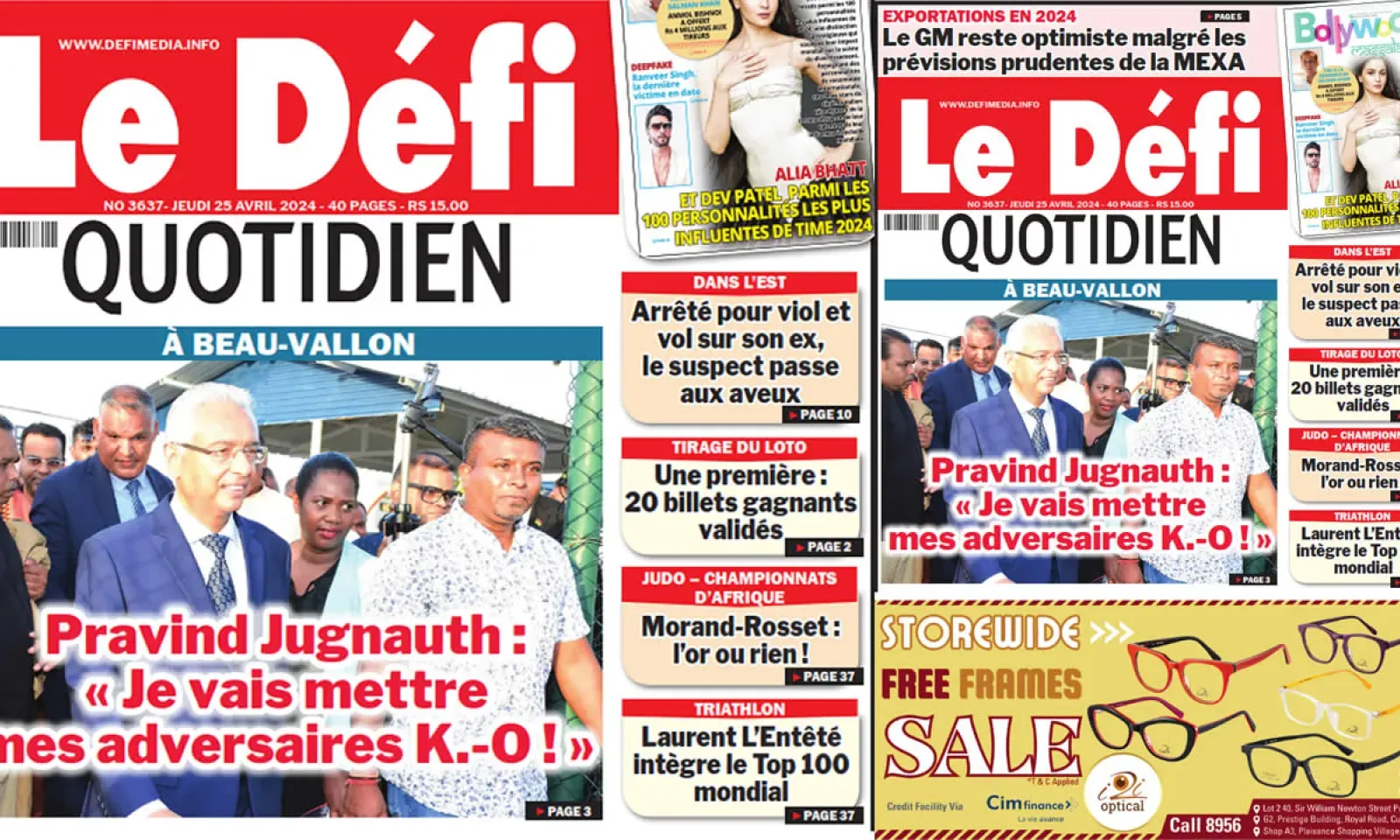 ? Voici la Une du Défi Quotidien. Le journal est en vente à Rs 15 l'exemplaire aux endroits habituels (supermarchés, boutiques, tabagies, superettes). Bonne lecture !