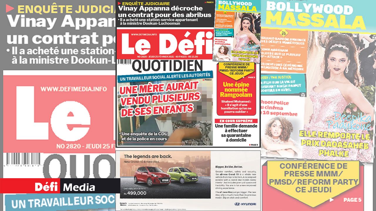 ? Voici la Une du Défi Quotidien. Le journal est en vente à Rs 15 l'exemplaire aux endroits habituels (supermarchés, boutiques, tabagies, superettes). Bonne lecture !