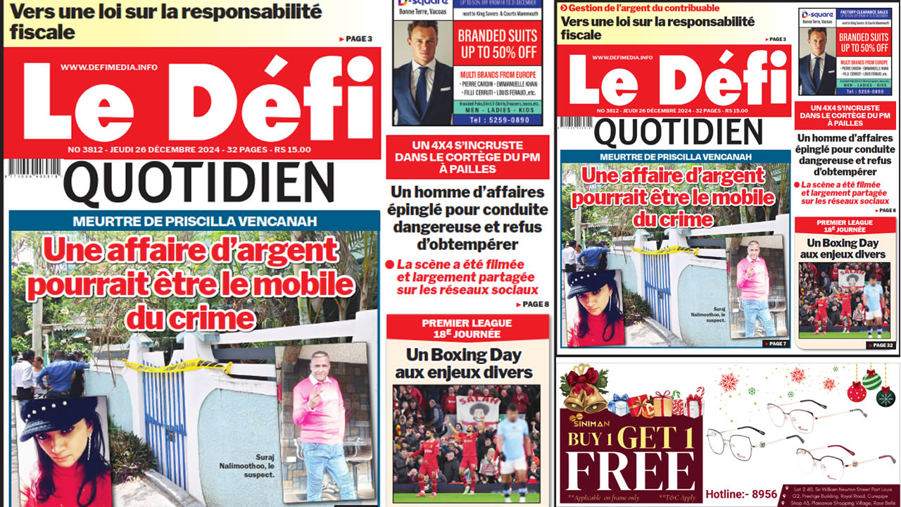 ? Voici la Une du Défi Quotidien. Le journal est en vente à Rs 15 l'exemplaire aux endroits habituels (supermarchés, boutiques, tabagies, superettes). Bonne lecture !