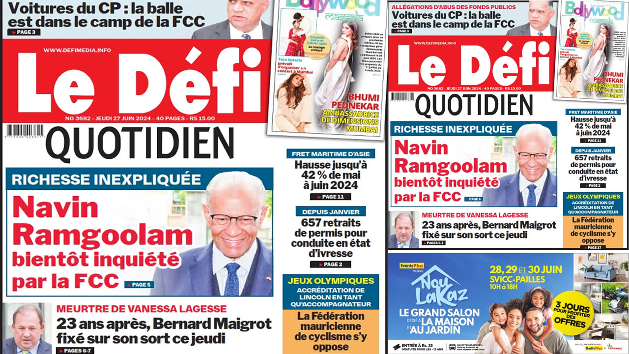 ? Voici la Une du Défi Quotidien. Le journal est en vente à Rs 15 l'exemplaire aux endroits habituels (supermarchés, boutiques, tabagies, superettes). Bonne lecture !