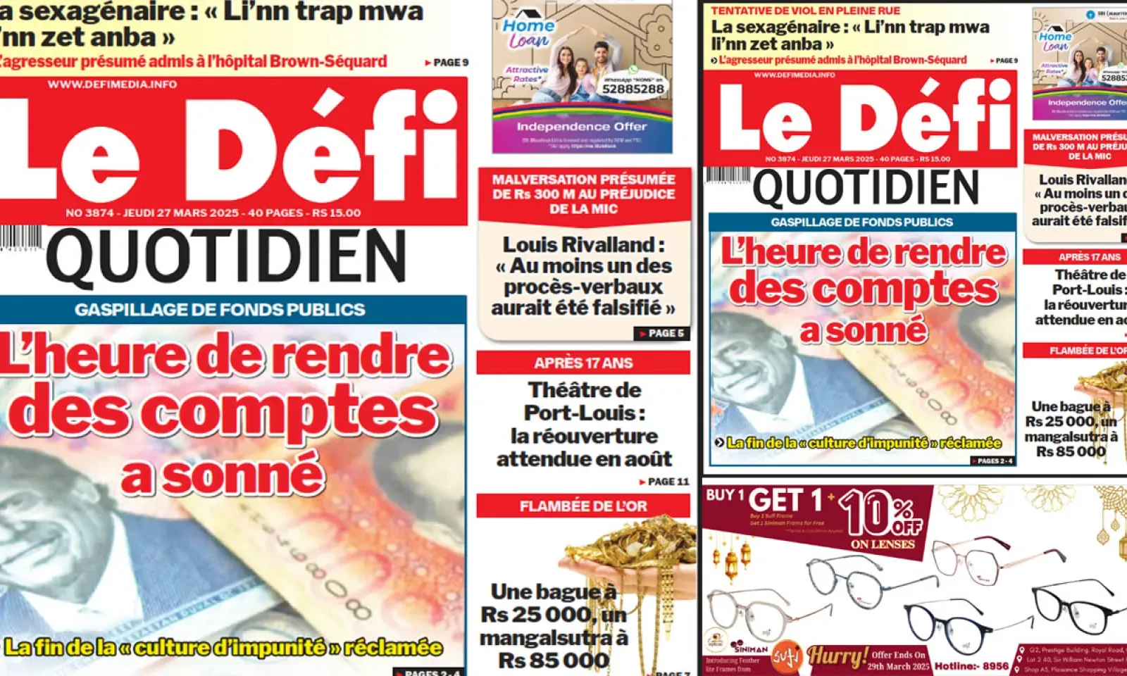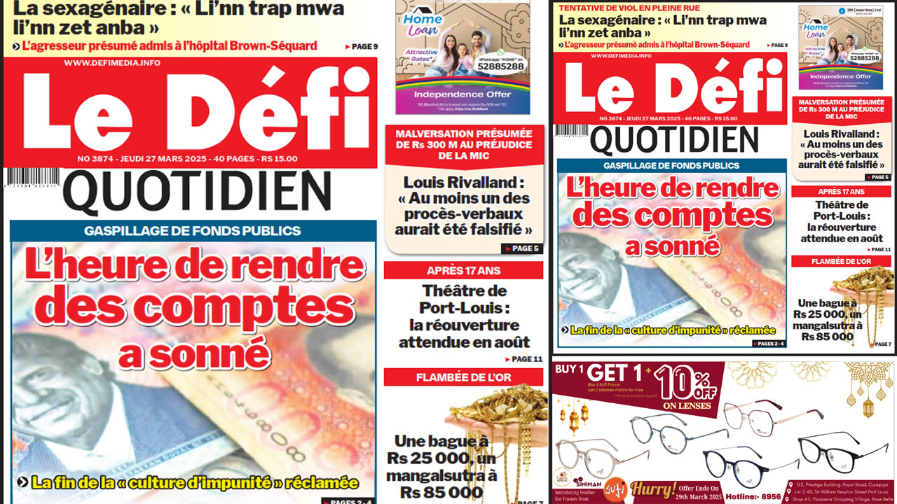 ? Voici la Une du Défi Quotidien. Le journal est en vente à Rs 15 l'exemplaire aux endroits habituels (supermarchés, boutiques, tabagies, superettes). Bonne lecture !