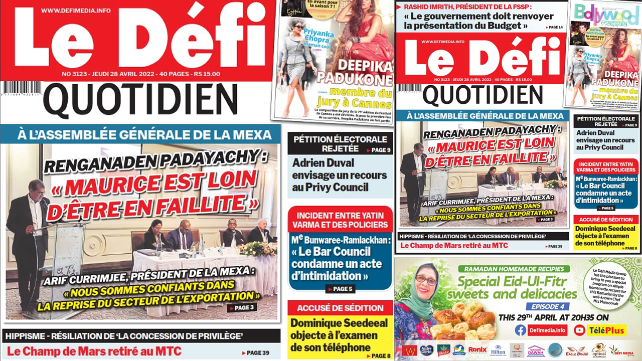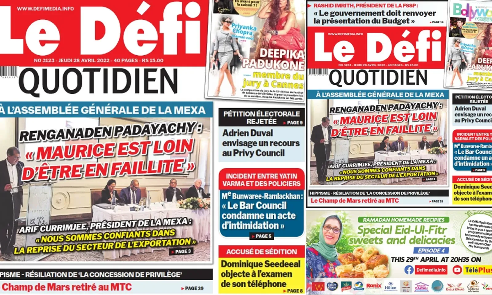 ? Voici la Une du Défi Quotidien. Le journal est en vente à Rs 15 l'exemplaire aux endroits habituels (supermarchés, boutiques, tabagies, superettes). Bonne lecture !