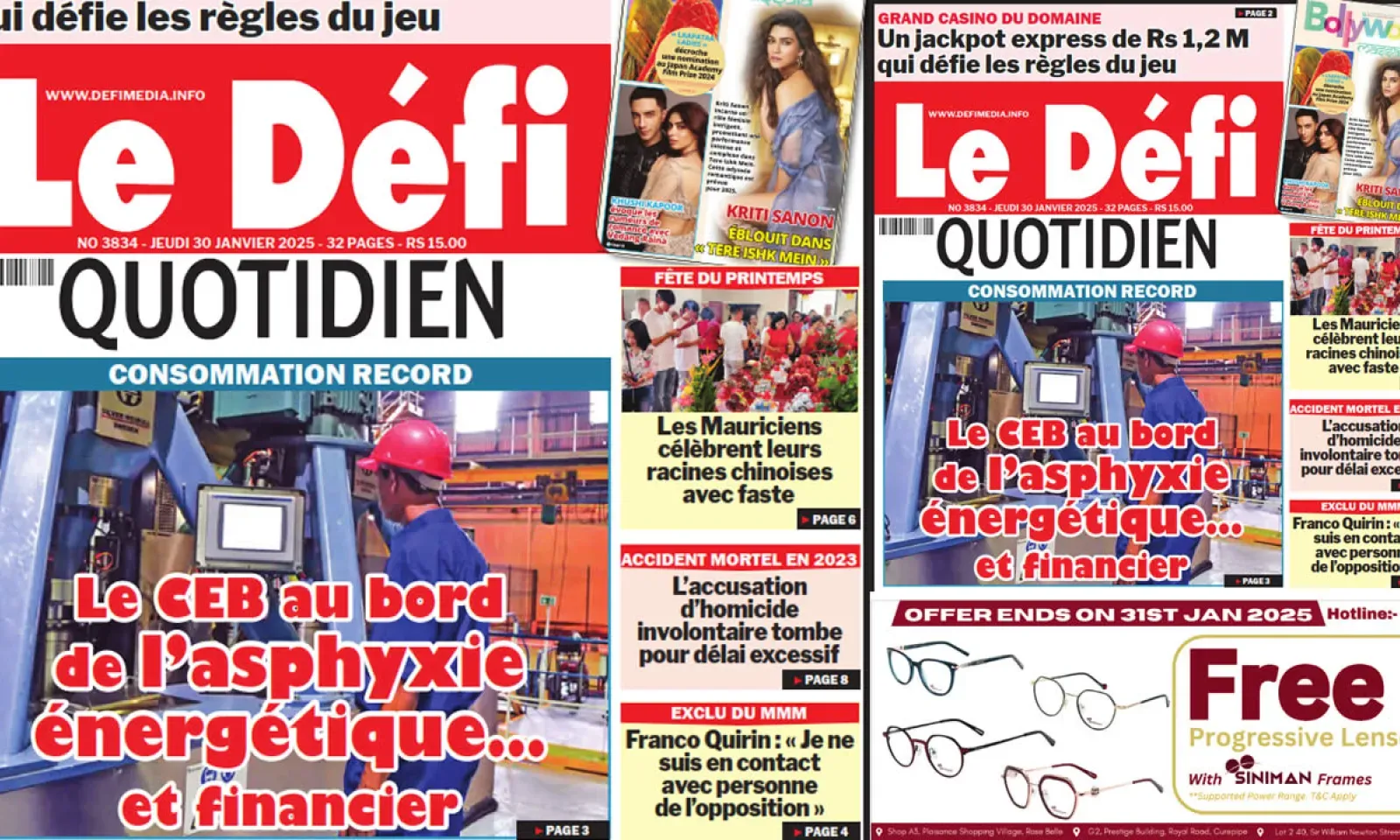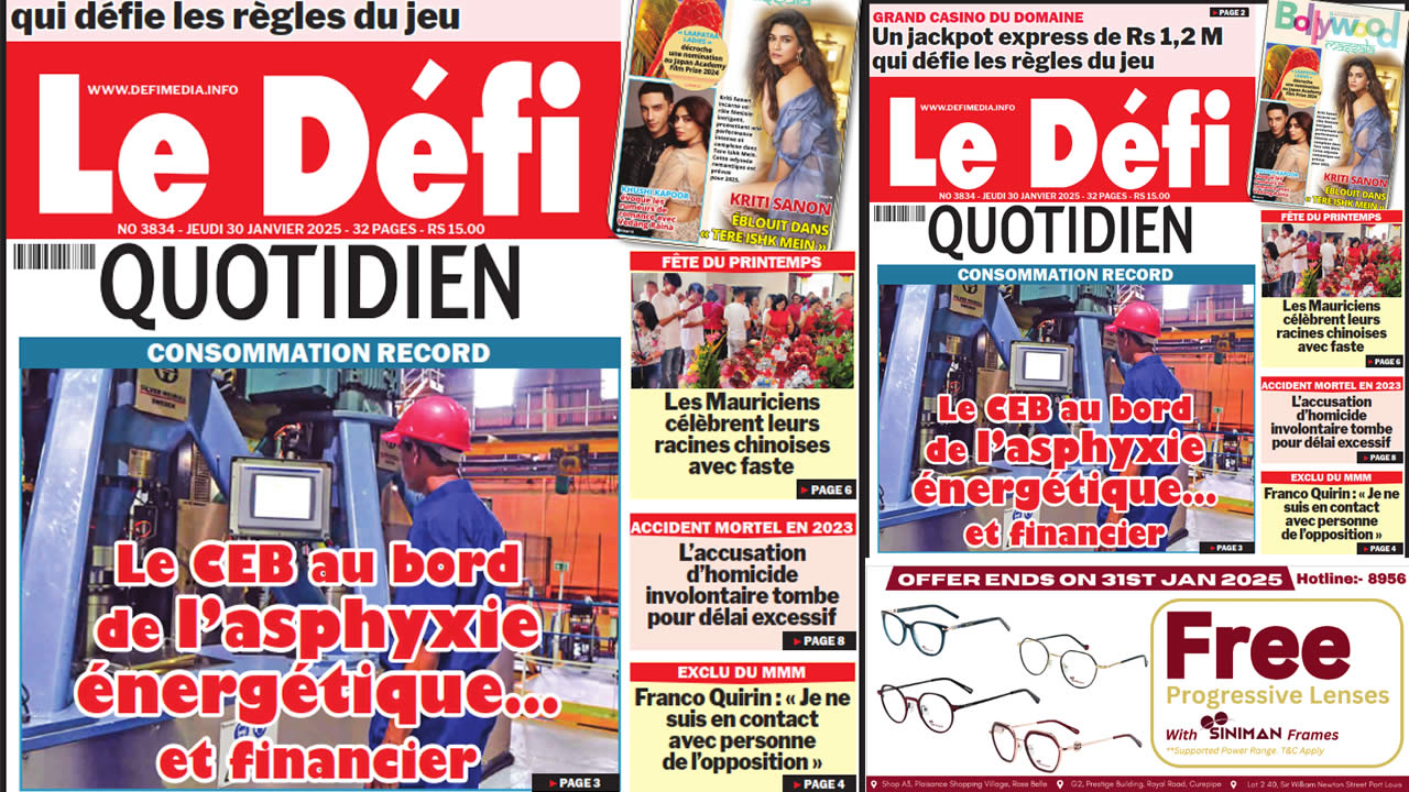 ? Voici la Une du Défi Quotidien. Le journal est en vente à Rs 15 l'exemplaire aux endroits habituels (supermarchés, boutiques, tabagies, superettes). Bonne lecture !