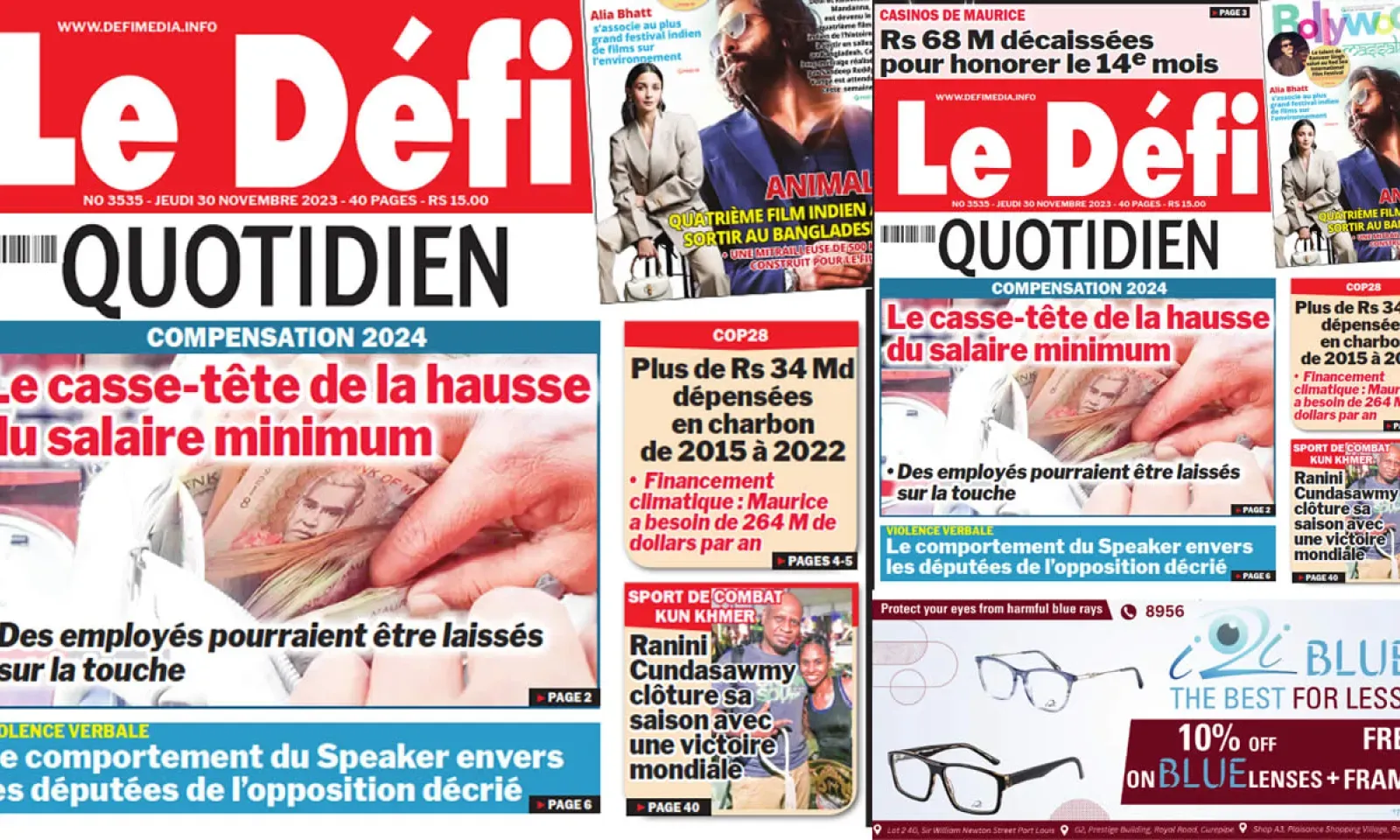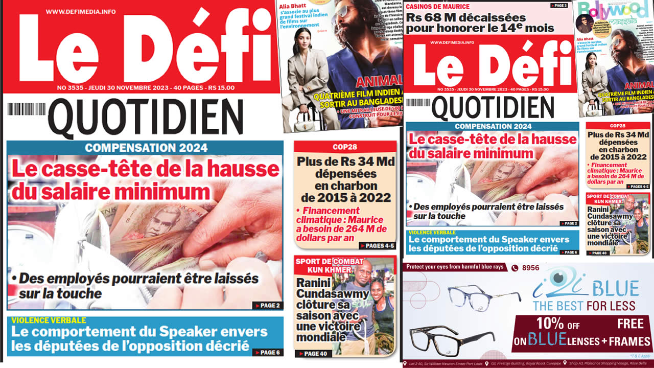 ? Voici la Une du Défi Quotidien. Le journal est en vente à Rs 15 l'exemplaire aux endroits habituels (supermarchés, boutiques, tabagies, superettes). Bonne lecture !
