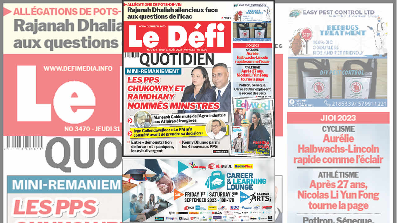 ? Voici la Une du Défi Quotidien. Le journal est en vente à Rs 15 l'exemplaire aux endroits habituels (supermarchés, boutiques, tabagies, superettes). Bonne lecture !