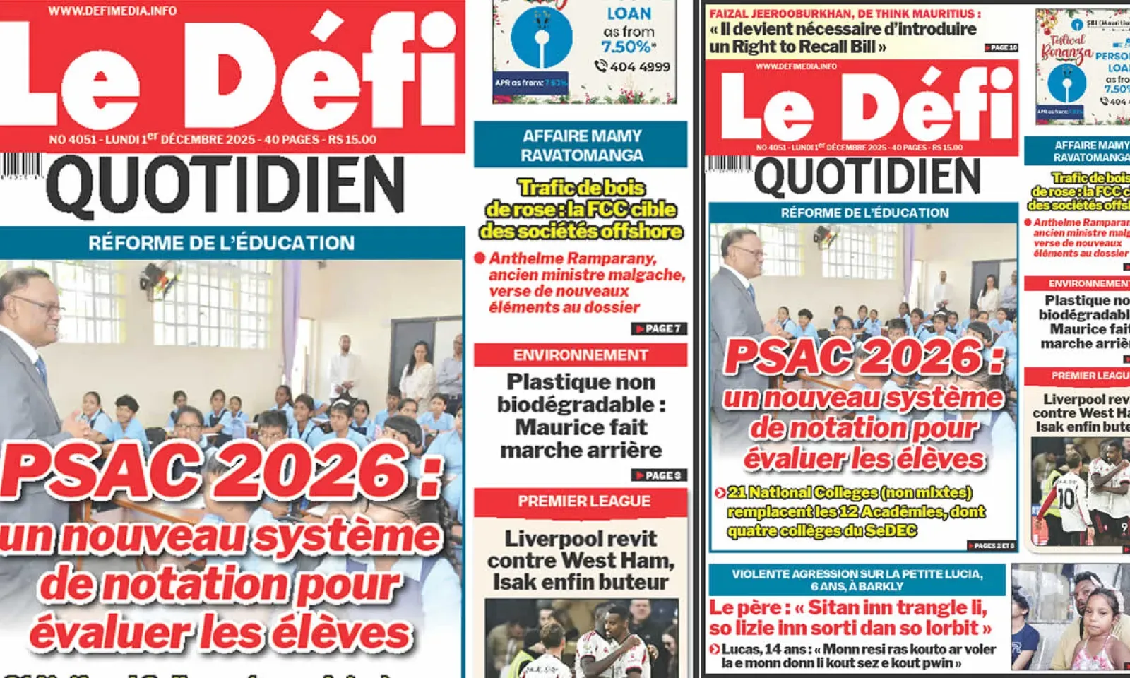 Voici la Une du Défi Quotidien. Le journal est en vente à Rs 15 l'exemplaire aux endroits habituels (supermarchés, boutiques, tabagies, superettes). Bonne lecture !
