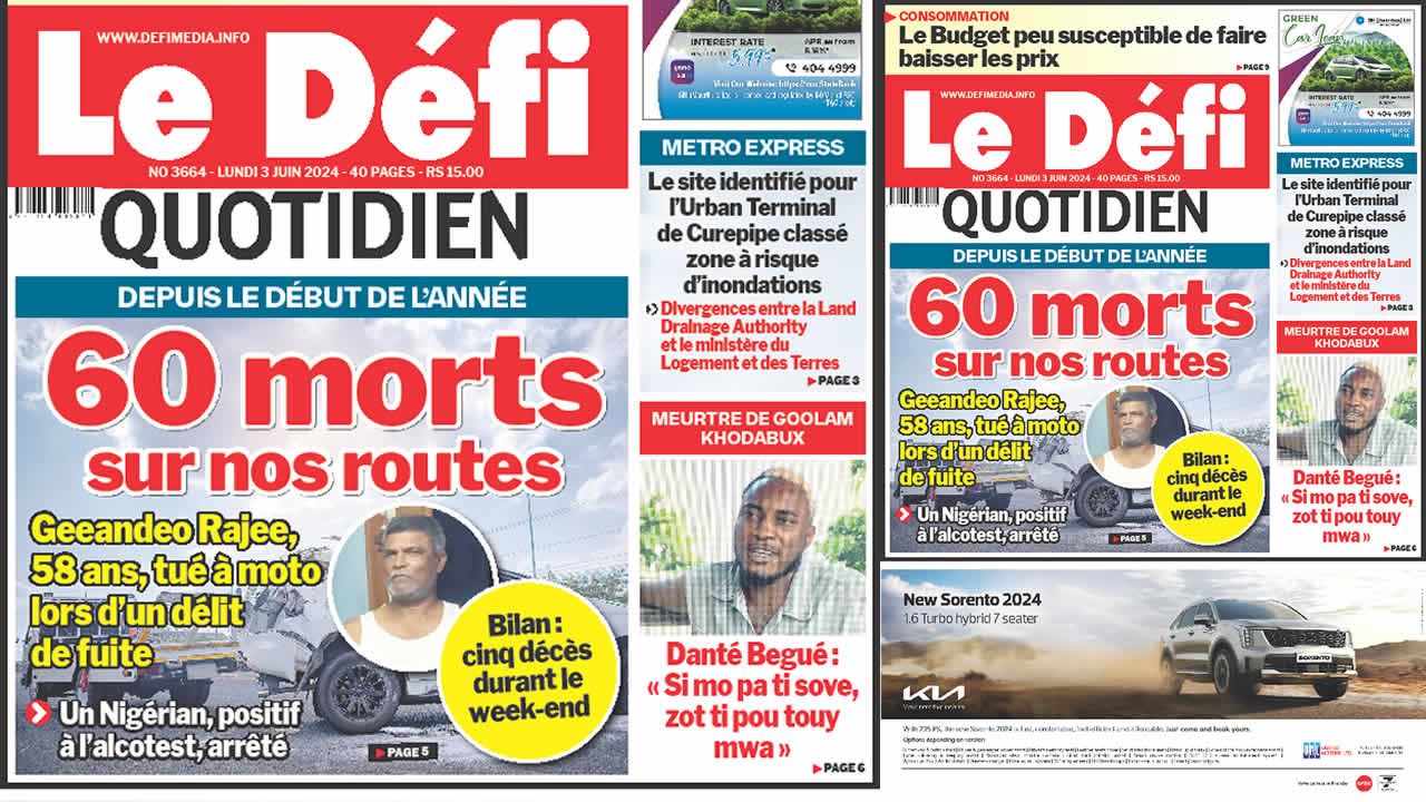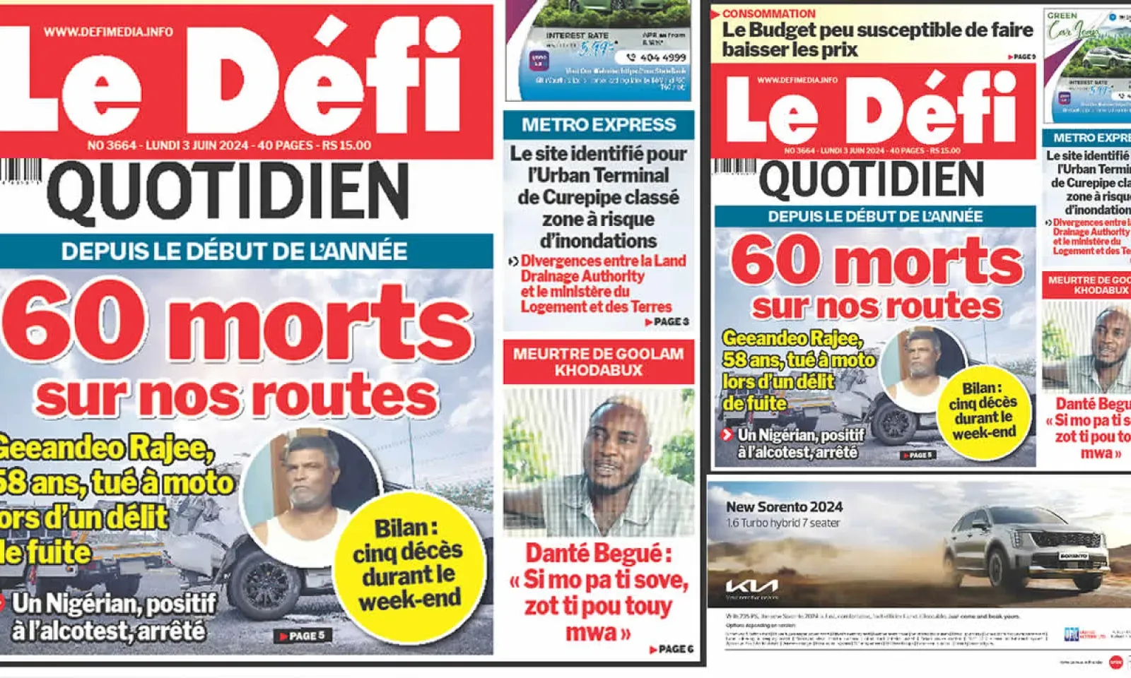 ? Voici la Une du Défi Quotidien. Le journal est en vente à Rs 15 l'exemplaire aux endroits habituels (supermarchés, boutiques, tabagies, superettes). Bonne lecture !