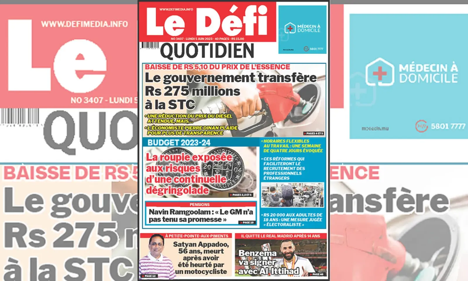? Voici la Une du Défi Quotidien. Le journal est en vente à Rs 15 l'exemplaire aux endroits habituels (supermarchés, boutiques, tabagies, superettes). Bonne lecture !