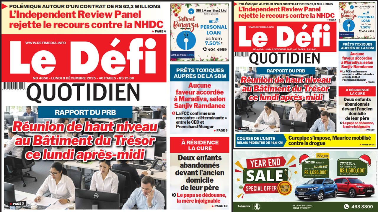 Voici la Une du Défi Quotidien. Le journal est en vente à Rs 15 l'exemplaire aux endroits habituels (supermarchés, boutiques, tabagies, superettes). Bonne lecture !