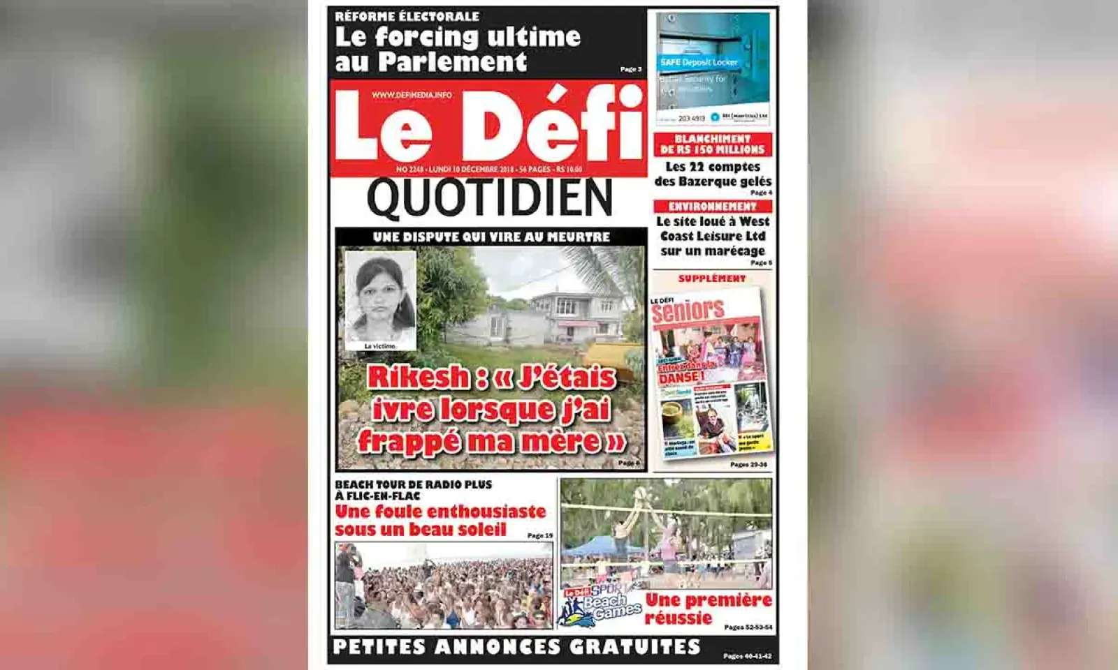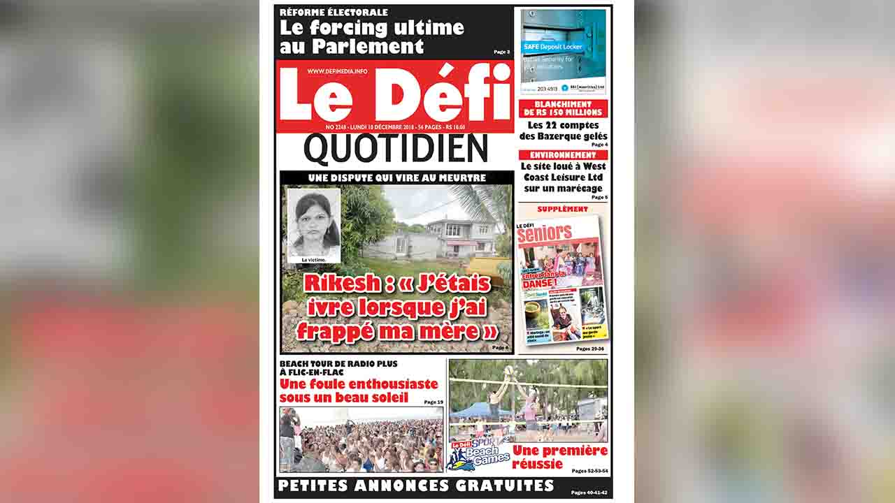 Pusspawuttee (Radha) Pusram est tombée sous les coups de son fils Rikesh. Le drame s’est joué à Lallmatie, mercredi. Après une beuverie, le fils, âgé de 30 ans, s’était disputé avec sa mère avant de la passer à tabac. Dimanche matin, Radha, âgée de 55 ans, a poussé son dernier souffle. Arrêté, le jeune homme est passé aux aveux.