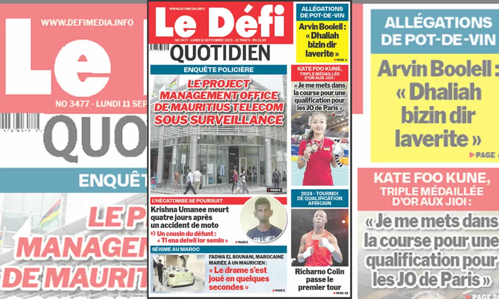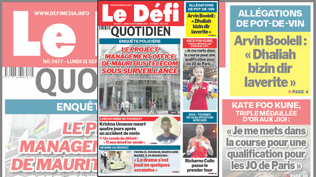 ? Voici la Une du Défi Quotidien. Le journal est en vente à Rs 15 l'exemplaire aux endroits habituels (supermarchés, boutiques, tabagies, superettes). Bonne lecture !