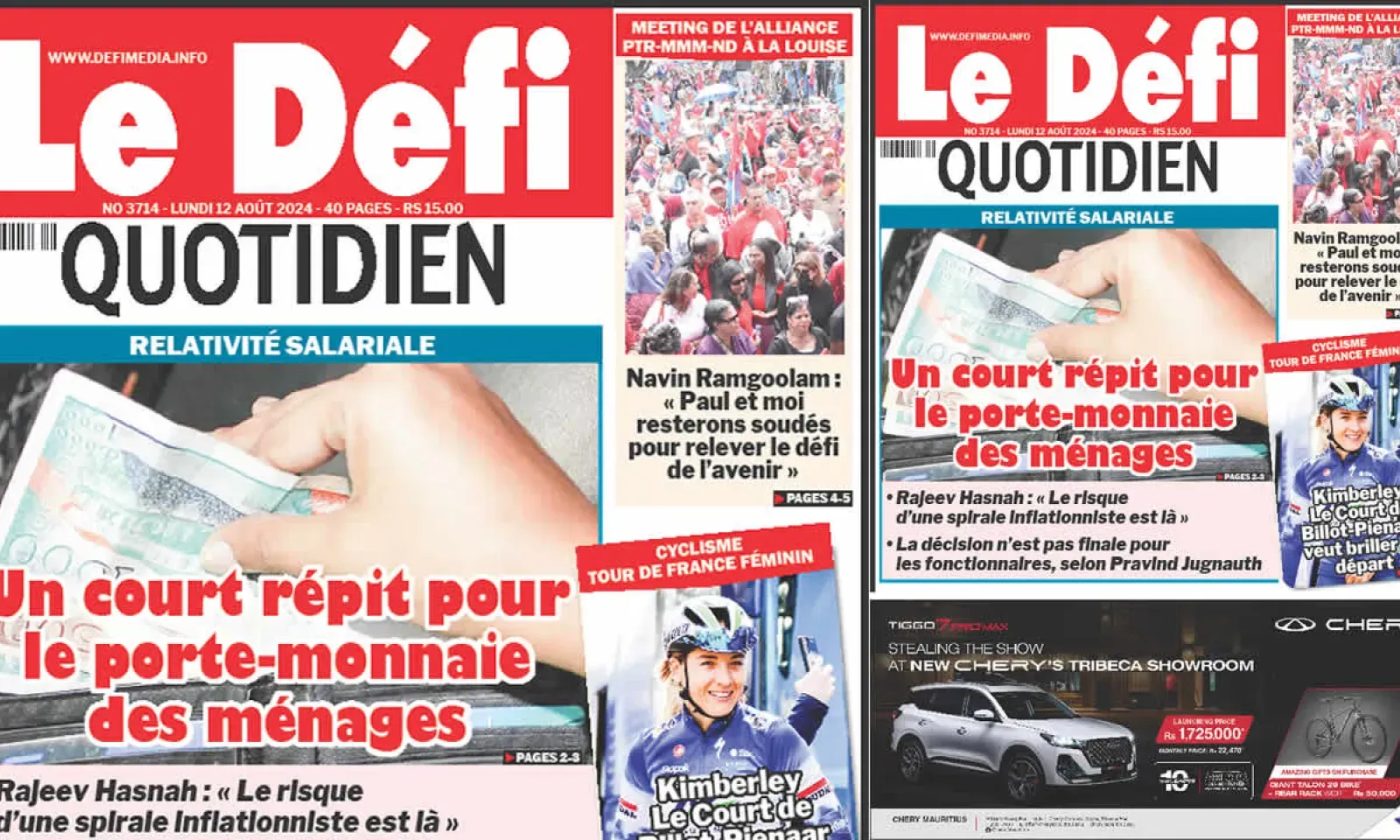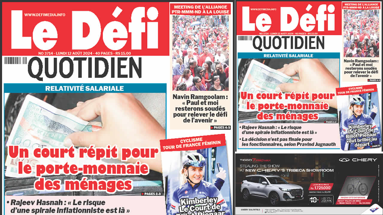 ? Voici la Une du Défi Quotidien. Le journal est en vente à Rs 15 l'exemplaire aux endroits habituels (supermarchés, boutiques, tabagies, superettes). Bonne lecture !