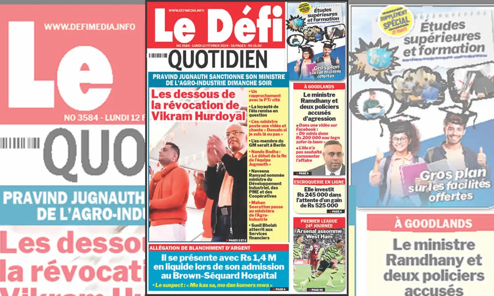 ? Voici la Une du Défi Quotidien. Le journal est en vente à Rs 15 l'exemplaire aux endroits habituels (supermarchés, boutiques, tabagies, superettes). Bonne lecture !