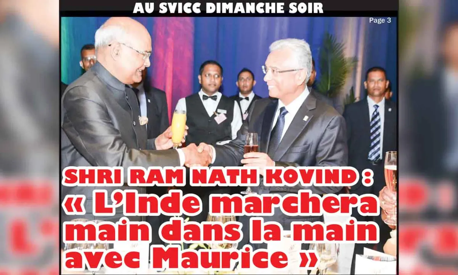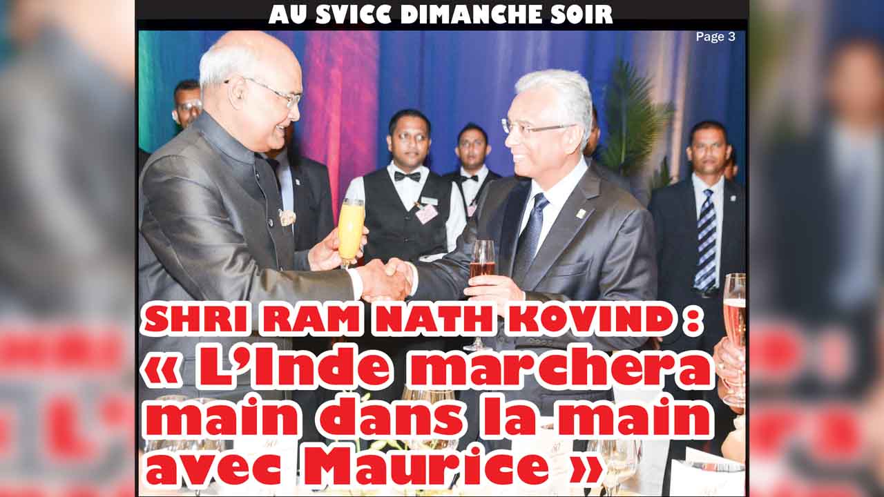 « L’inde marchera main dans la main avec Maurice ». Propos de Shri Ram Nath Kovind, président de la République de l’Inde, lors du banquet en son honneur, au SVICC à Pailles, dans la soirée du dimanche 11 mars. Le président indien a aussi souligné que l’Inde soutiendra Maurice dans les projets Metro Express, les constructions des maisons sociaux et pour les développements d’infrastructure à Agaléga.