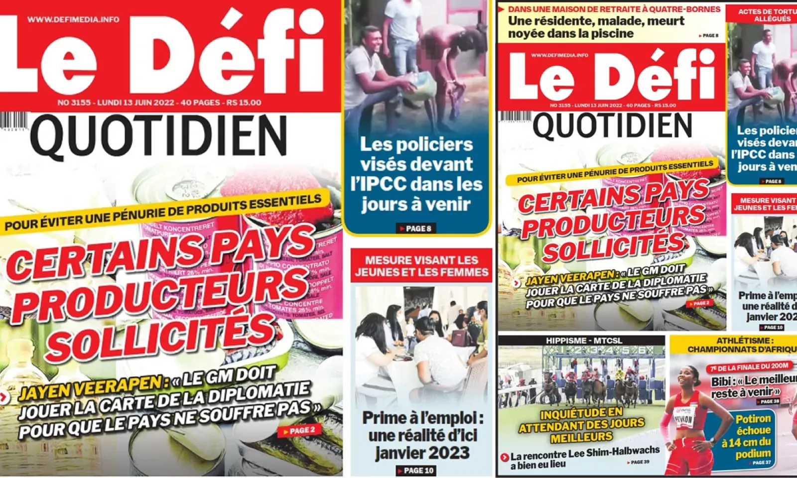 ? Voici la Une du Défi Quotidien. Le journal est en vente à Rs 15 l'exemplaire aux endroits habituels (supermarchés, boutiques, tabagies, superettes). Bonne lecture !