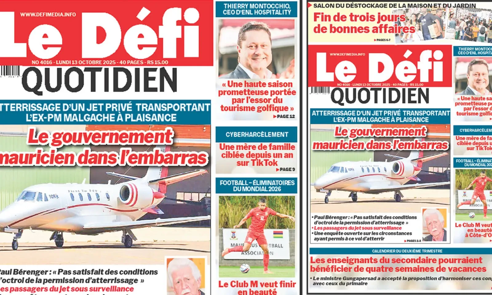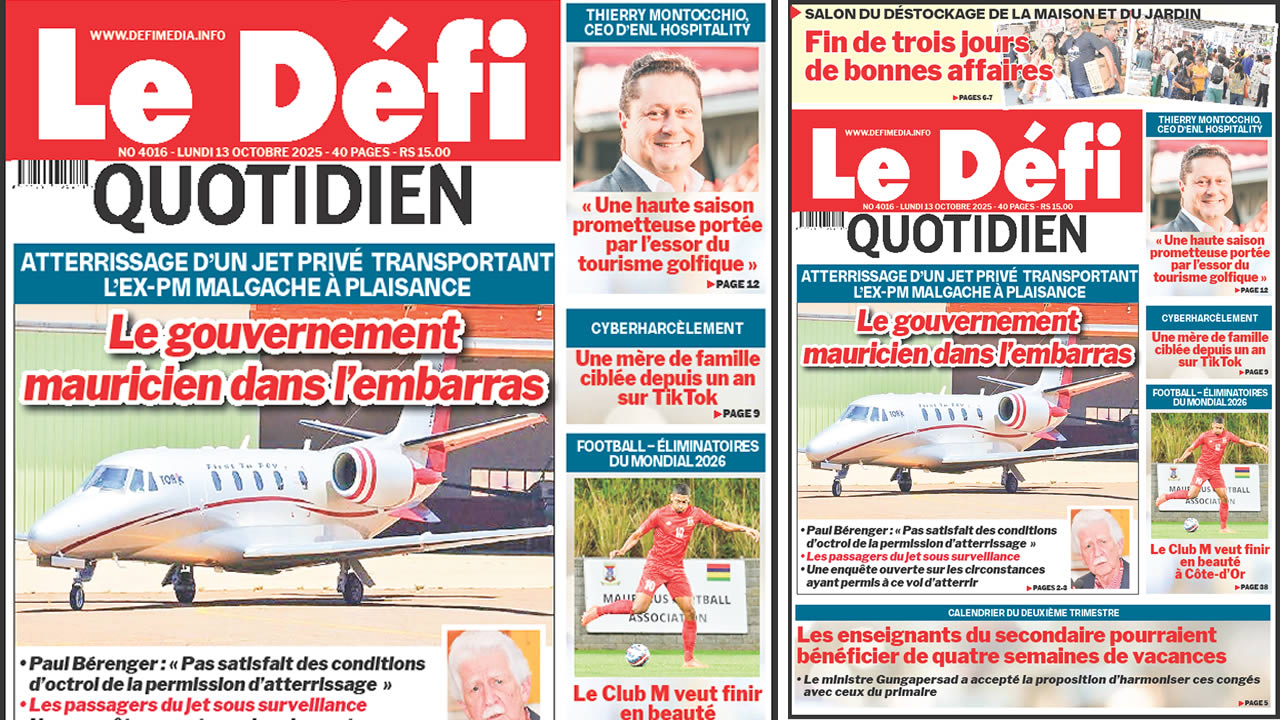 ? Voici la Une du Défi Quotidien. Le journal est en vente à Rs 15 l'exemplaire aux endroits habituels (supermarchés, boutiques, tabagies, superettes). Bonne lecture !