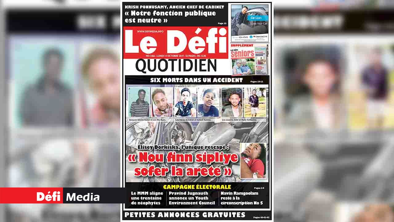 Voici la Une du Defi Quotidien de ce lundi 14 octobre 2019