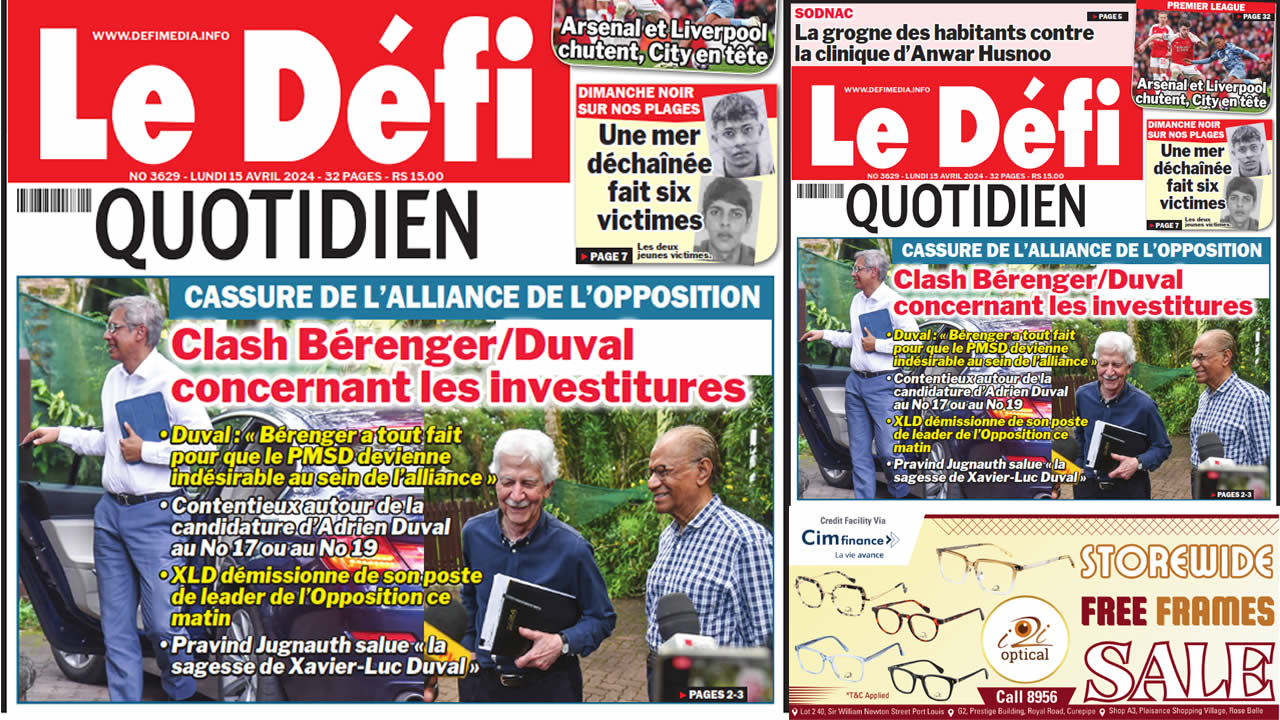 ? Voici la Une du Défi Quotidien. Le journal est en vente à Rs 15 l'exemplaire aux endroits habituels (supermarchés, boutiques, tabagies, superettes). Bonne lecture !