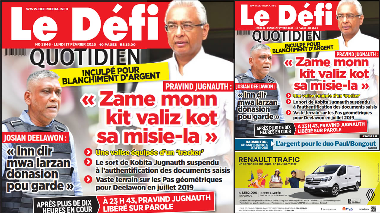 ? Voici la Une du Défi Quotidien. Le journal est en vente à Rs 15 l'exemplaire aux endroits habituels (supermarchés, boutiques, tabagies, superettes). Bonne lecture !