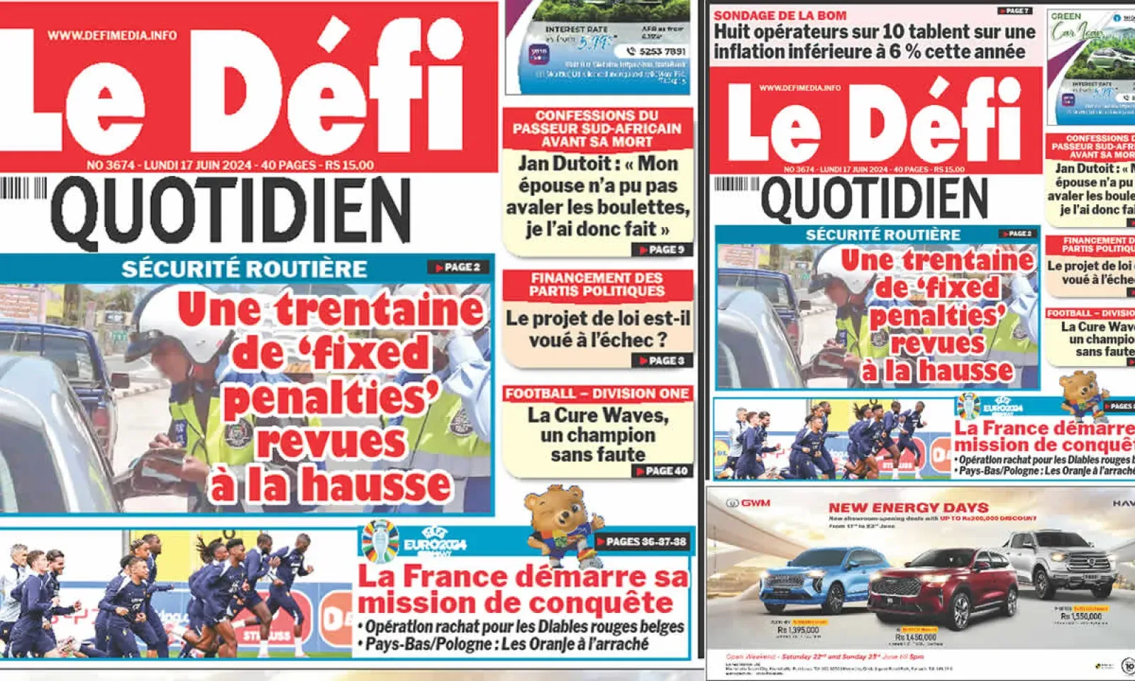 ? Voici la Une du Défi Quotidien. Le journal est en vente à Rs 15 l'exemplaire aux endroits habituels (supermarchés, boutiques, tabagies, superettes). Bonne lecture !