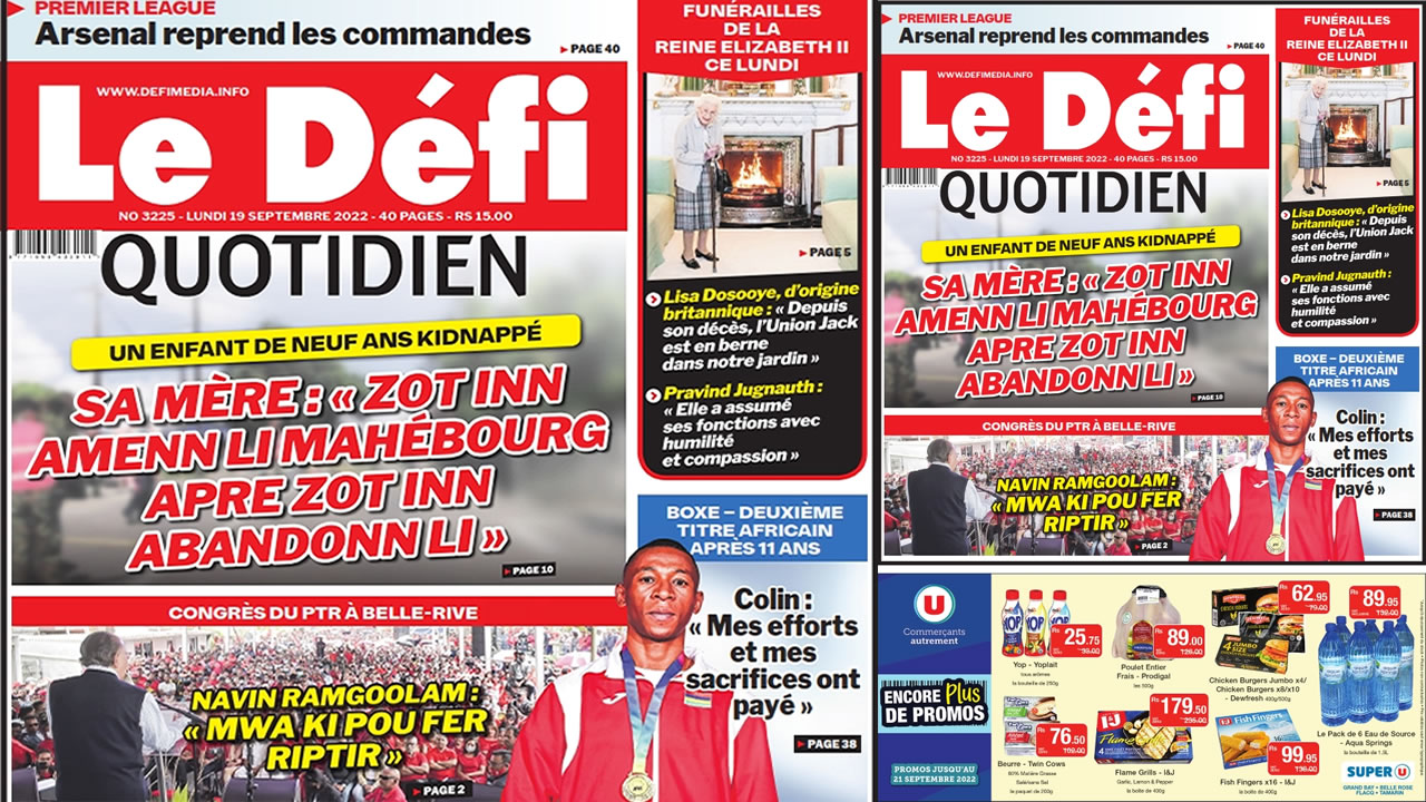 Voici la une du Défi Quotidien de ce lundi 19 Septembre 2022