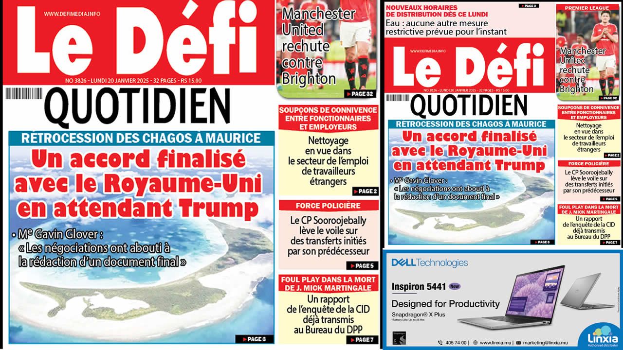? Voici la Une du Défi Quotidien. Le journal est en vente à Rs 15 l'exemplaire aux endroits habituels (supermarchés, boutiques, tabagies, superettes). Bonne lecture !
