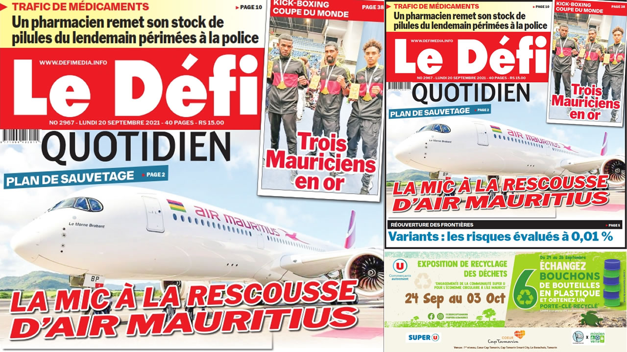 ? Voici la Une du Défi Quotidien. Le journal est en vente à Rs 15 l'exemplaire aux endroits habituels (supermarchés, boutiques, tabagies, superettes). Bonne lecture !