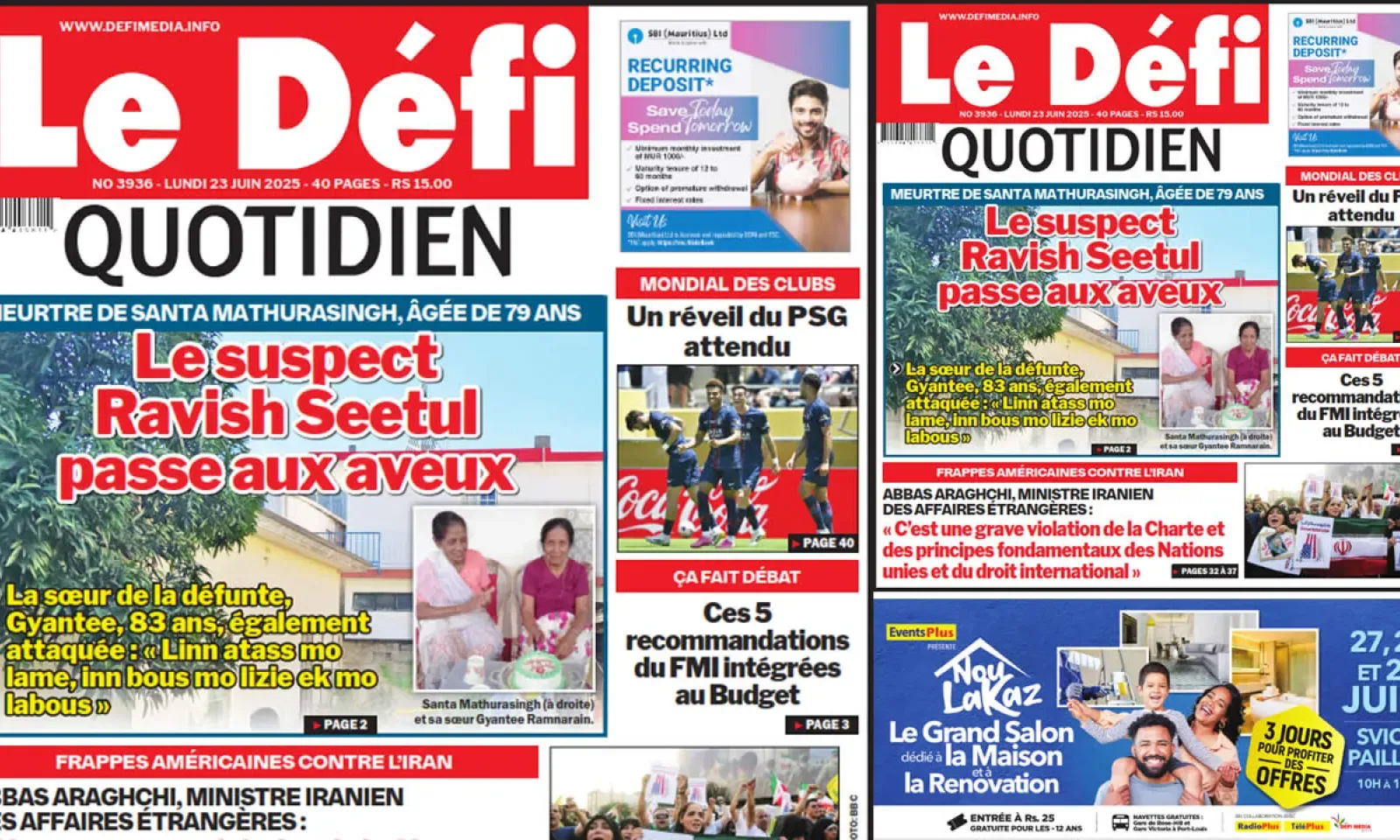 ? Voici la Une du Défi Quotidien. Le journal est en vente à Rs 15 l'exemplaire aux endroits habituels (supermarchés, boutiques, tabagies, superettes). Bonne lecture !