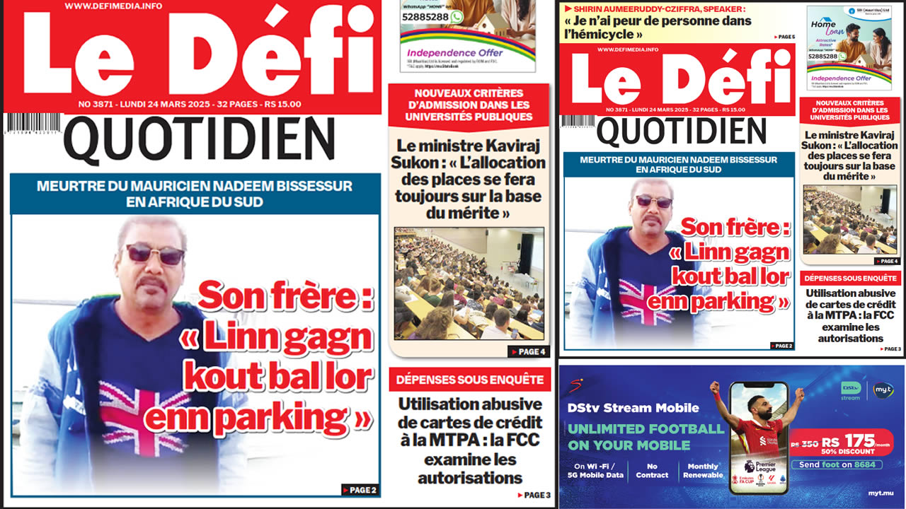 ? Voici la Une du Défi Quotidien. Le journal est en vente à Rs 15 l'exemplaire aux endroits habituels (supermarchés, boutiques, tabagies, superettes). Bonne lecture !
