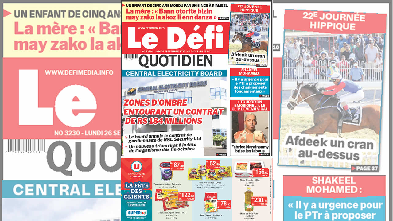 ? Voici la Une du Défi Quotidien. Le journal est en vente à Rs 15 l'exemplaire aux endroits habituels (supermarchés, boutiques, tabagies, superettes). Bonne lecture !