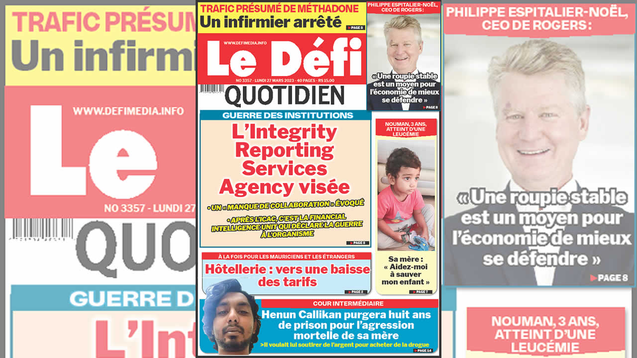 ? Voici la Une du Défi Quotidien. Le journal est en vente à Rs 15 l'exemplaire aux endroits habituels (supermarchés, boutiques, tabagies, superettes). Bonne lecture !