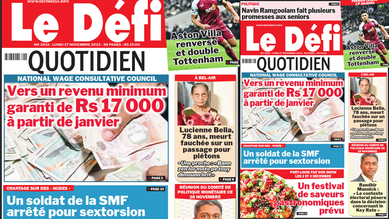 ? Voici la Une du Défi Quotidien. Le journal est en vente à Rs 15 l'exemplaire aux endroits habituels (supermarchés, boutiques, tabagies, superettes). Bonne lecture !