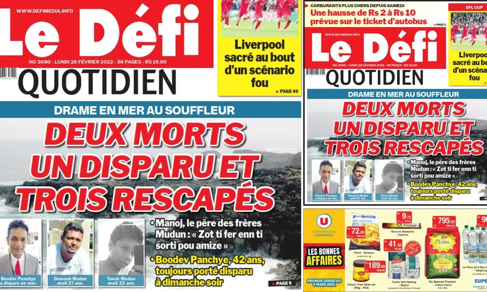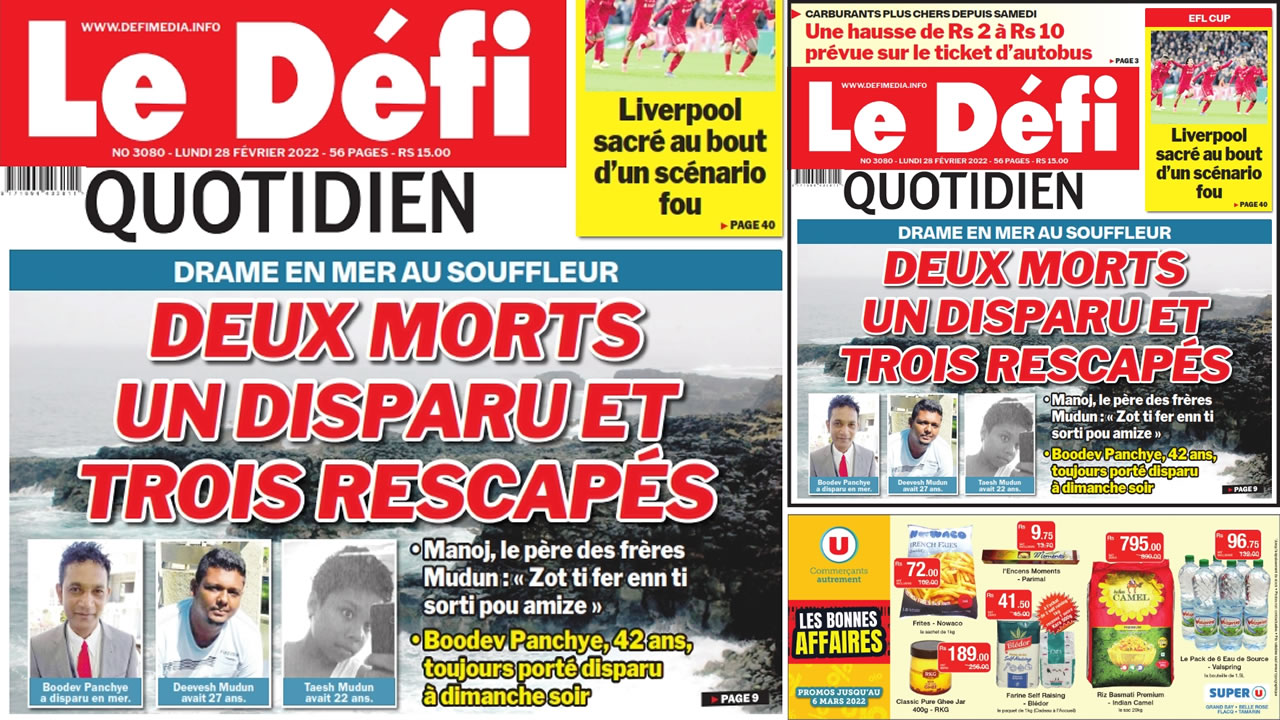 ? Voici la Une du Défi Quotidien. Le journal est en vente à Rs 15 l'exemplaire aux endroits habituels (supermarchés, boutiques, tabagies, superettes). Bonne lecture !