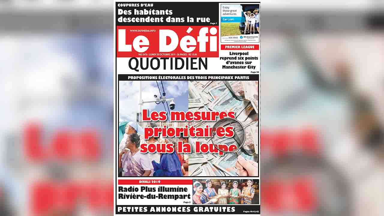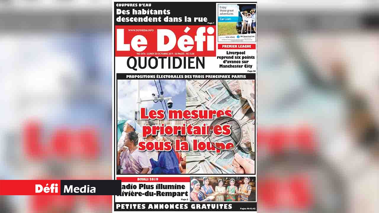 Voici la Une du Defi Quotidien de ce lundi 28 octobre 2019