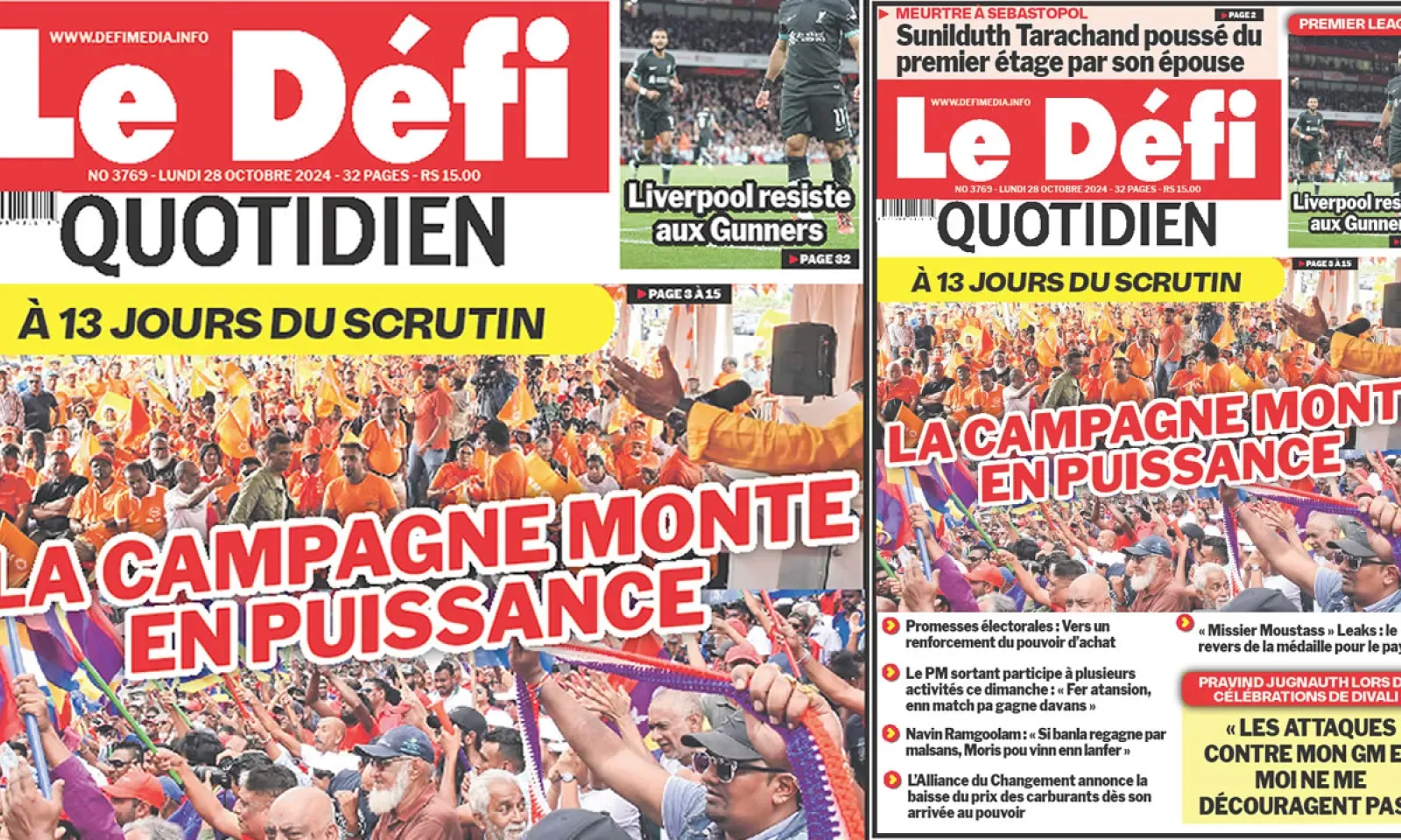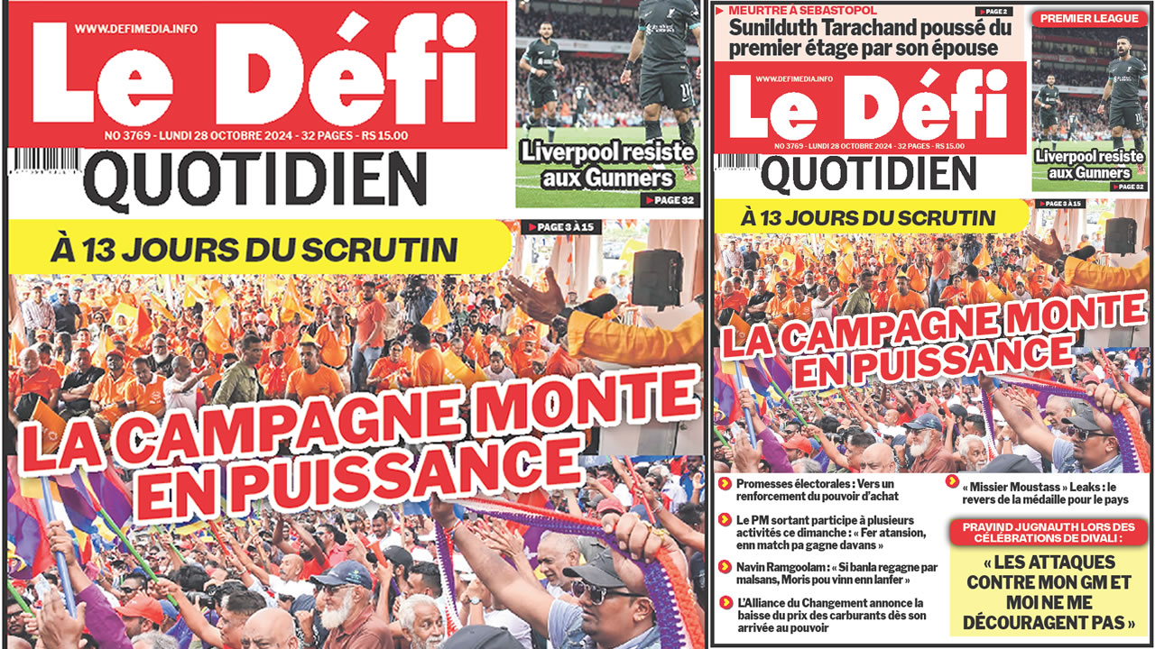 ? Voici la Une du Défi Quotidien. Le journal est en vente à Rs 15 l'exemplaire aux endroits habituels (supermarchés, boutiques, tabagies, superettes). Bonne lecture !