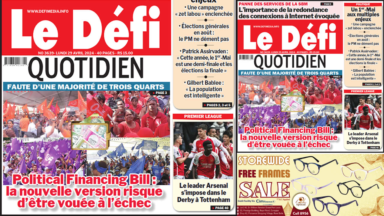 ? Voici la Une du Défi Quotidien. Le journal est en vente à Rs 15 l'exemplaire aux endroits habituels (supermarchés, boutiques, tabagies, superettes). Bonne lecture !
