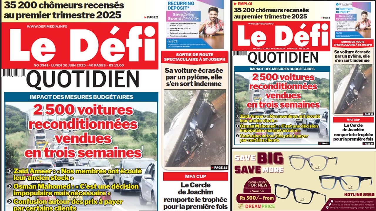 ? Voici la Une du Défi Quotidien. Le journal est en vente à Rs 15 l'exemplaire aux endroits habituels (supermarchés, boutiques, tabagies, superettes). Bonne lecture !
